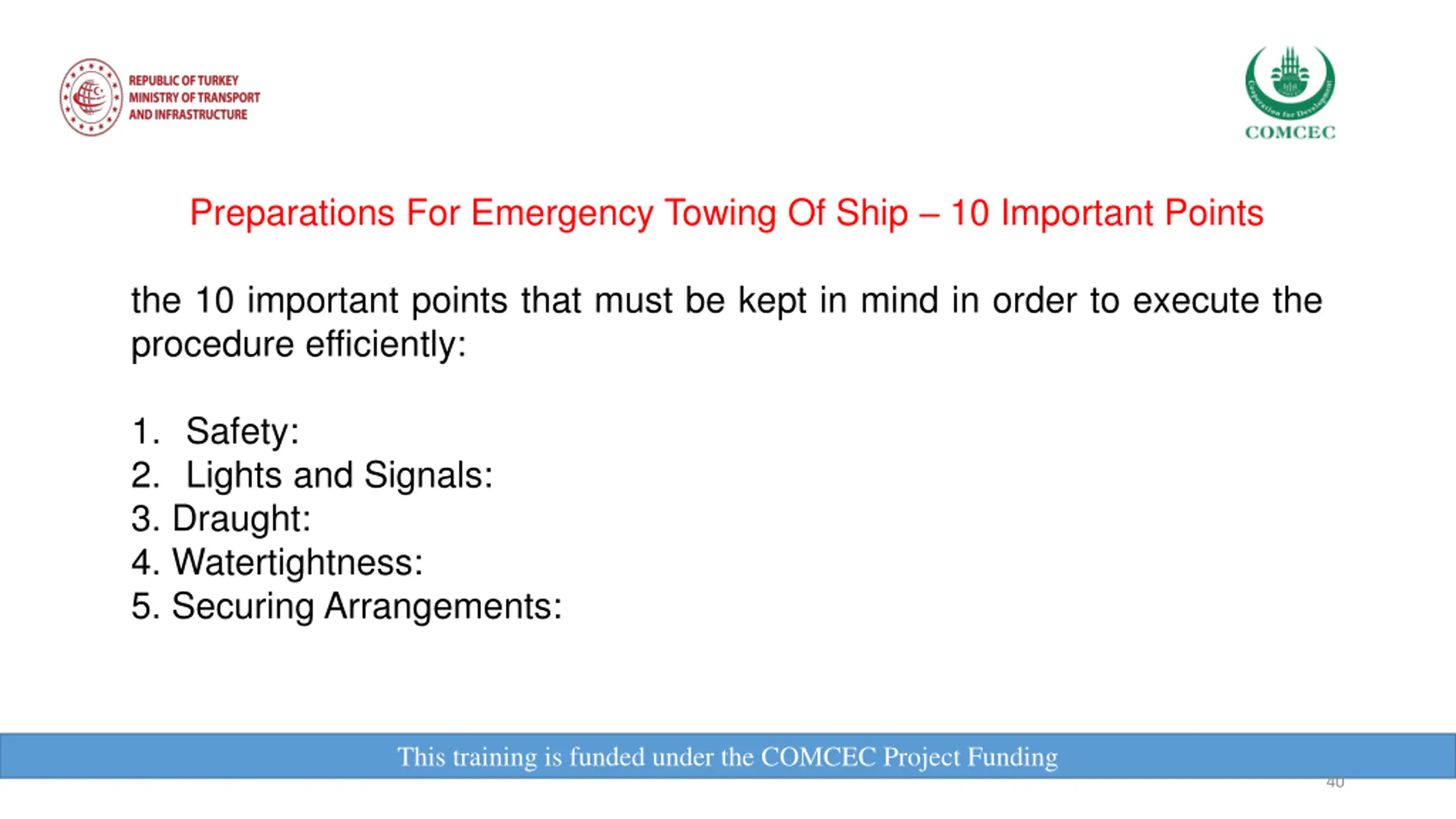 Preparations For Emergency Towing Of Ship 10 Important Points the 10 important points that must be kept in mind in order to execute the procedure efficiently: 1. Safety: 2. Lights and Signals: 3. Draught: 4. Watertightness: 5. Securing Arrangements: This training is funded under the COMCEC Project Funding 40