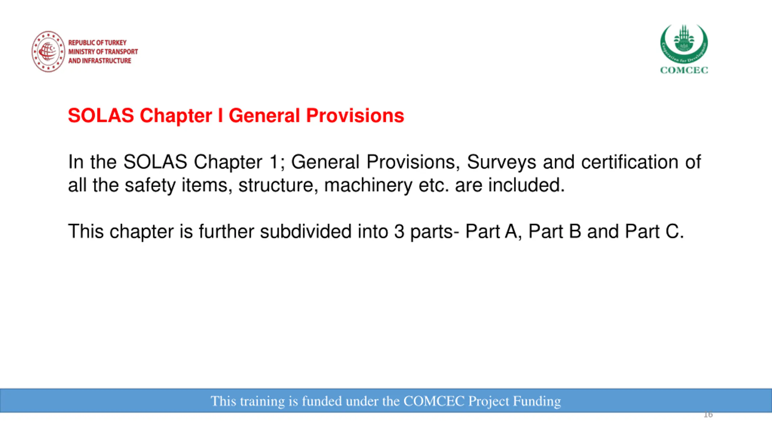SOLAS Chapter I General Provisions In the SOLAS Chapter 1; General Provisions, Surveys and certification of all the safety items, structure, machinery etc. are included. This chapter is further subdivided into 3 parts- Part A, Part B and Part C. This training is funded under the COMCEC Project Funding 16