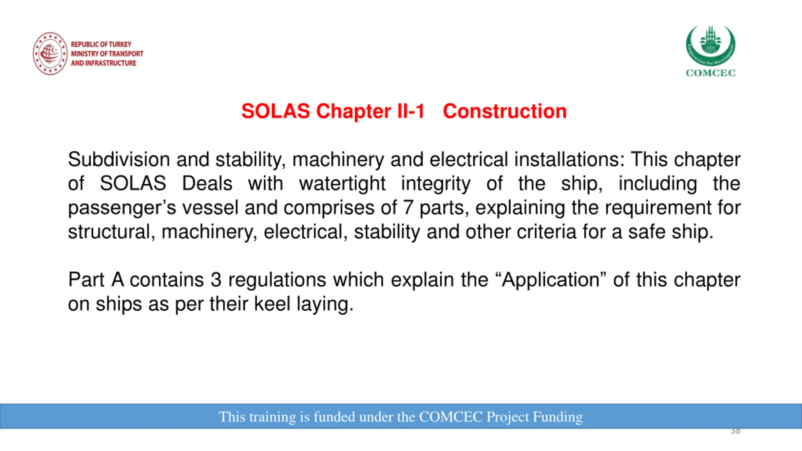 SOLAS Chapter II-1 Construction Subdivision and stability, machinery and electrical installations: This chapter of SOLAS Deals with watertight integrity of the ship, including the passenger s vessel and comprises of 7 parts, explaining the requirement for structural, machinery, electrical, stability and other criteria for a safe ship. Part A contains 3 regulations which explain the Application of this chapter on ships as per their keel laying. This training is funded under the COMCEC Project Funding 38
