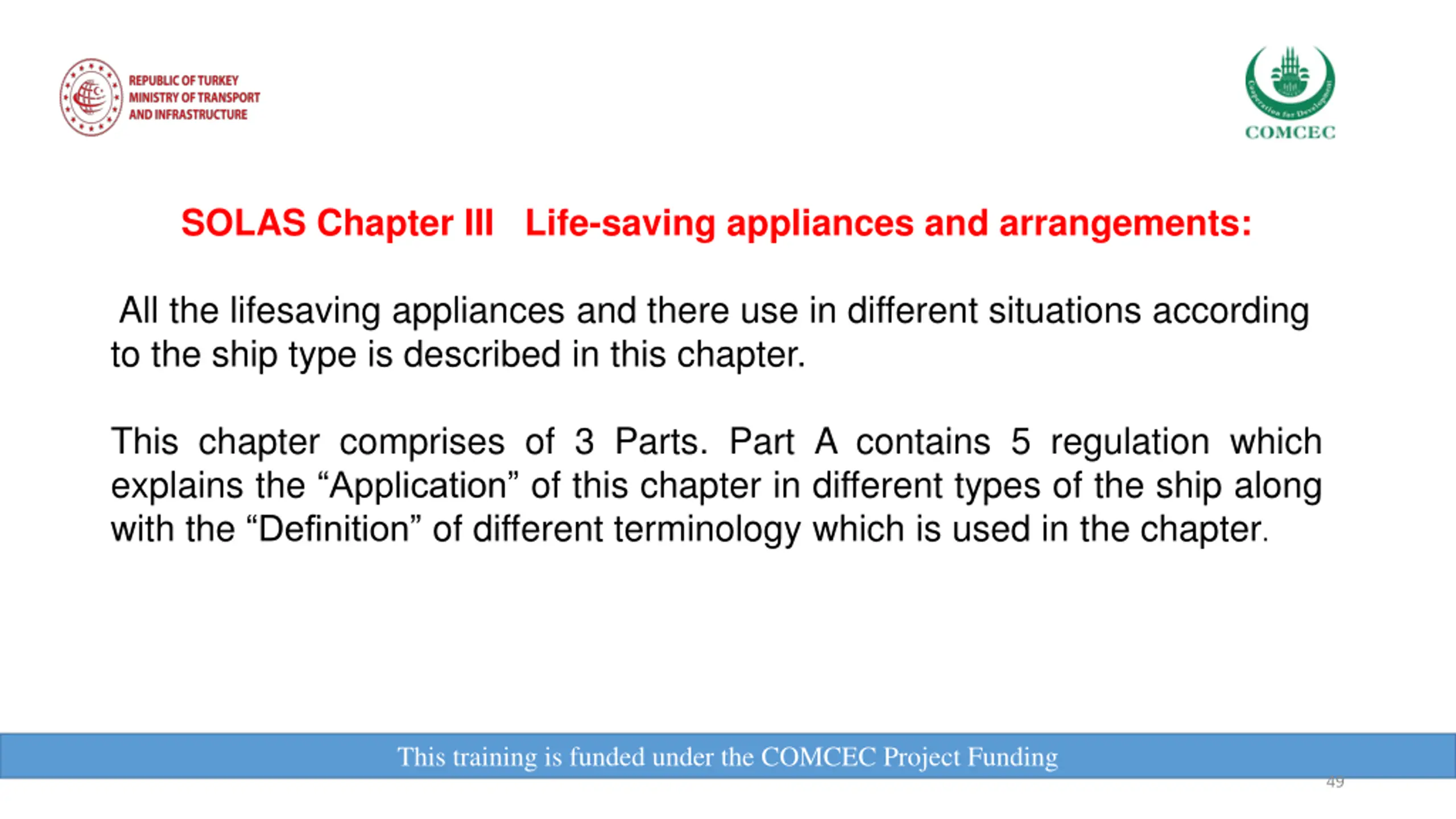 SOLAS Chapter III Life-saving appliances and arrangements: All the lifesaving appliances and there use in different situations according to the ship type is described in this chapter. This chapter comprises of 3 Parts. Part A contains 5 regulation which explains the Application of this chapter in different types of the ship along with the Definition of different terminology which is used in the chapter. This training is funded under the COMCEC Project Funding 49