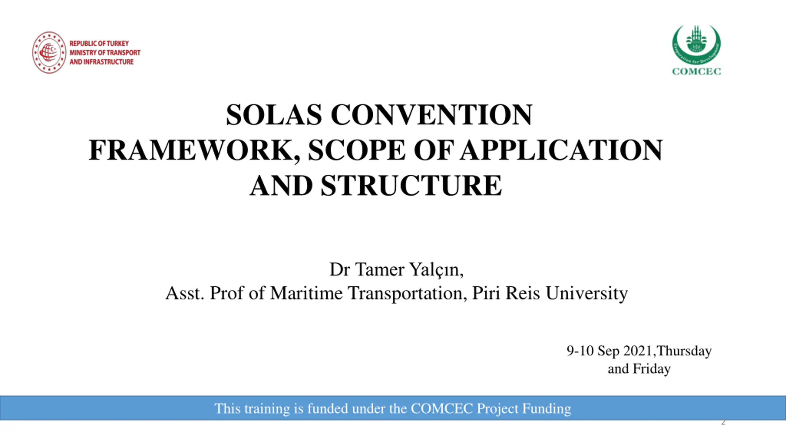 SOLAS CONVENTION FRAMEWORK, SCOPE OF APPLICATION AND STRUCTURE Dr Tamer Yal n, Asst. Prof of Maritime Transportation, Piri Reis University 9-10 Sep 2021,Thursday and Friday This training is funded under the COMCEC Project Funding 2