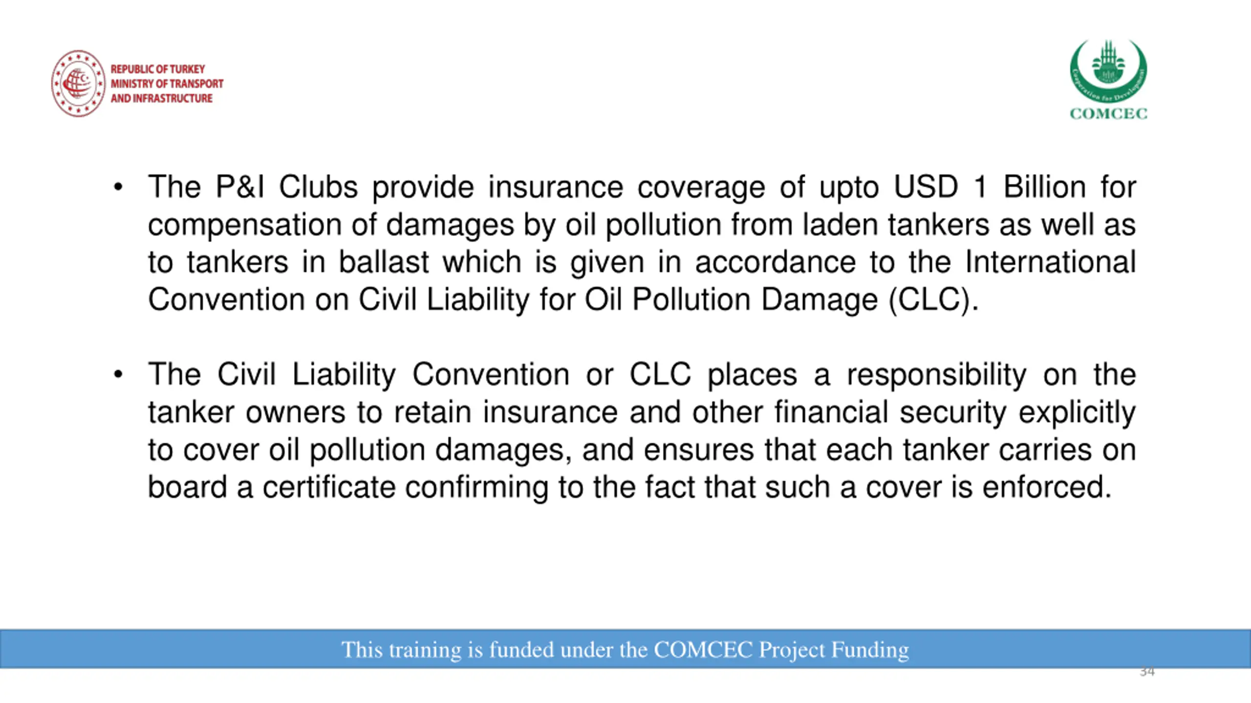 The P&I Clubs provide insurance coverage of upto USD 1 Billion for compensation of damages by oil pollution from laden tankers as well as to tankers in ballast which is given in accordance to the International Convention on Civil Liability for Oil Pollution Damage (CLC). The Civil Liability Convention or CLC places a responsibility on the tanker owners to retain insurance and other financial security explicitly to cover oil pollution damages, and ensures that each tanker carries on board a certificate confirming to the fact that such a cover is enforced. This training is funded under the COMCEC Project Funding 34