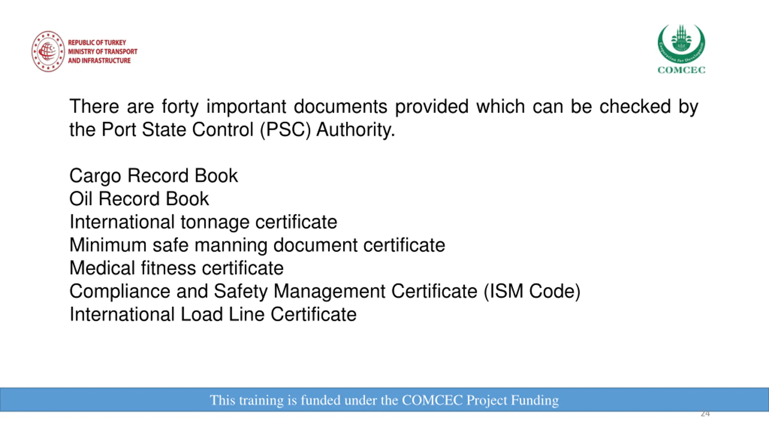 There are forty important documents provided which can be checked by the Port State Control (PSC) Authority. Cargo Record Book Oil Record Book International tonnage certificate Minimum safe manning document certificate Medical fitness certificate Compliance and Safety Management Certificate (ISM Code) International Load Line Certificate This training is funded under the COMCEC Project Funding 24