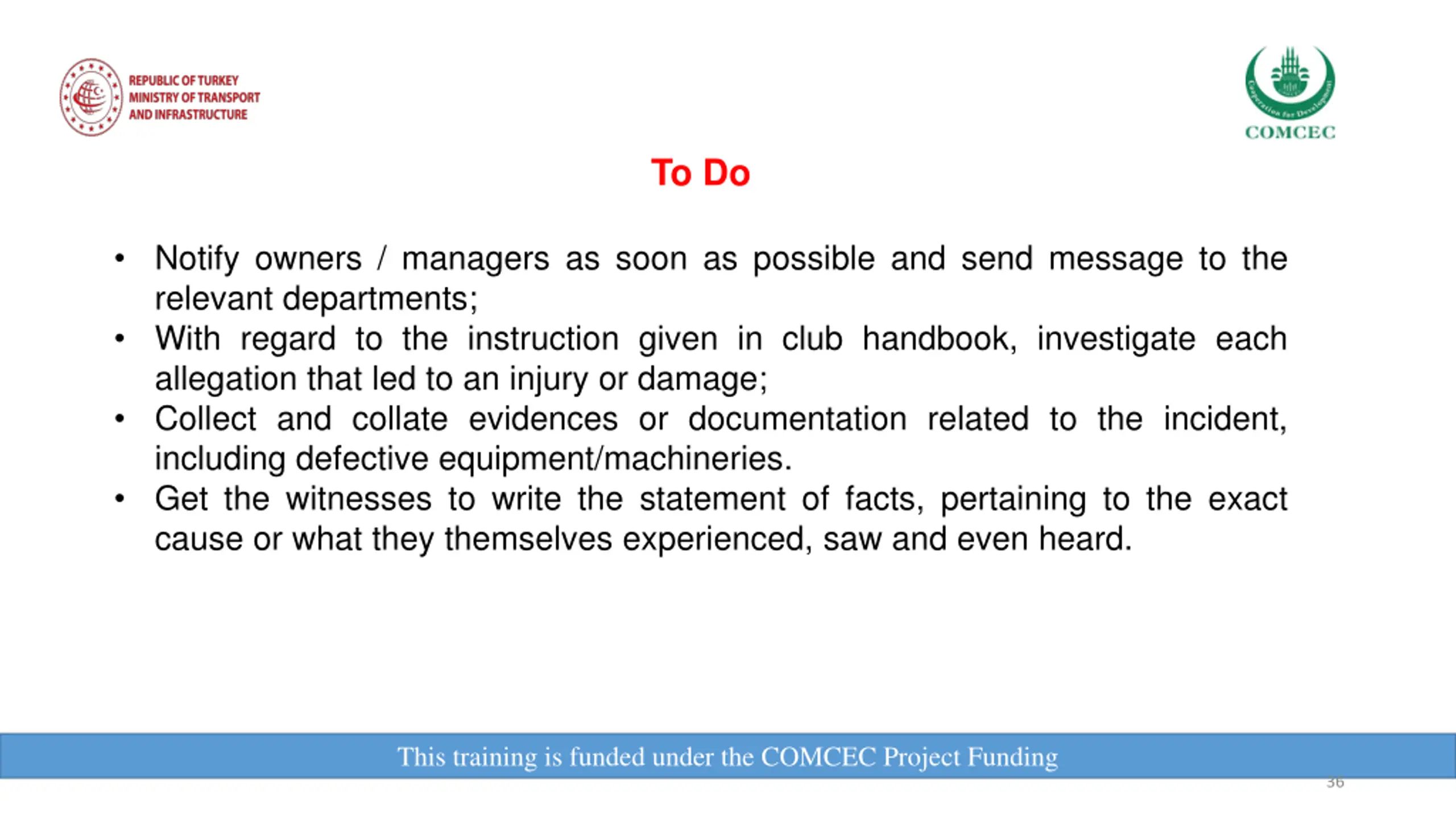 To Do Notify owners / managers as soon as possible and send message to the relevant departments; With regard to the instruction given in club handbook, investigate each allegation that led to an injury or damage; Collect and collate evidences or documentation related to the incident, including defective equipment/machineries. Get the witnesses to write the statement of facts, pertaining to the exact cause or what they themselves experienced, saw and even heard. This training is funded under the COMCEC Project Funding 36