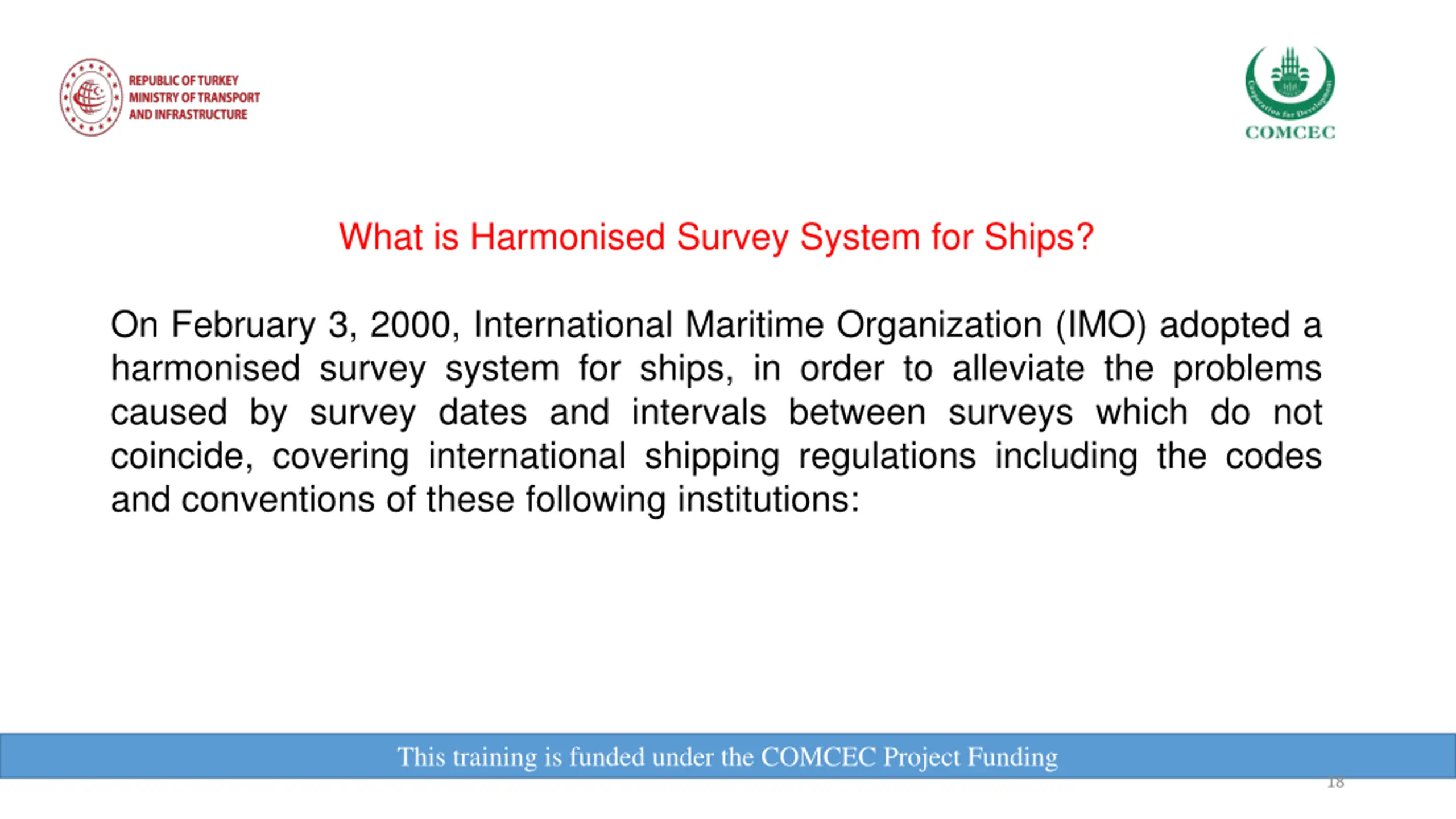 What is Harmonised Survey System for Ships? On February 3, 2000, International Maritime Organization (IMO) adopted a harmonised survey system for ships, in order to alleviate the problems caused by survey dates and intervals between surveys which do not coincide, covering international shipping regulations including the codes and conventions of these following institutions: This training is funded under the COMCEC Project Funding 18