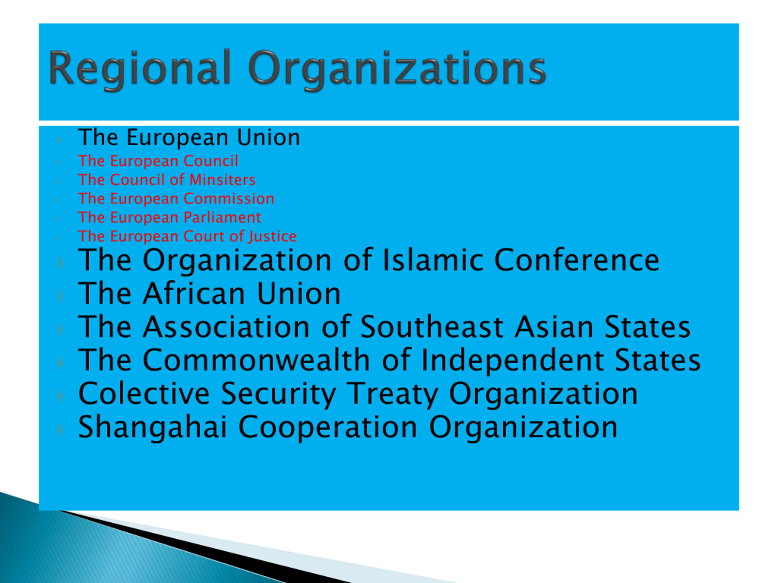 The European Union The European Council The Council of Minsiters The European Commission The European Parliament The European Court of Justice The Organization of Islamic Conference The African Union The Association of Southeast Asian States The Commonwealth of Independent States Colective Security Treaty Organization Shangahai Cooperation Organization