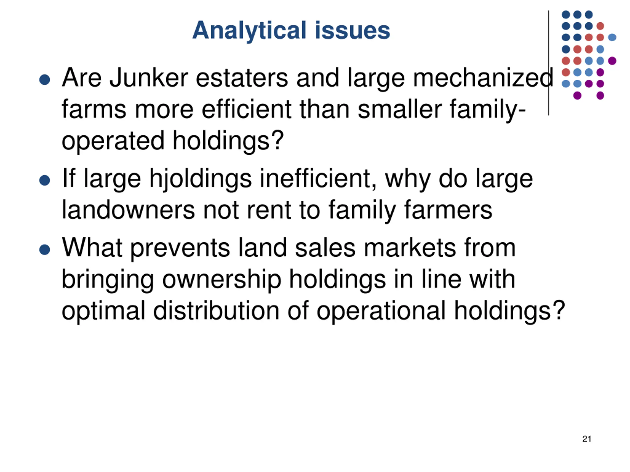 Analytical issues Are Junker estaters and large mechanized farms more efficient than smaller family- operated holdings? If large hjoldings inefficient, why do large landowners not rent to family farmers What prevents land sales markets from bringing ownership holdings in line with optimal distribution of operational holdings? 21