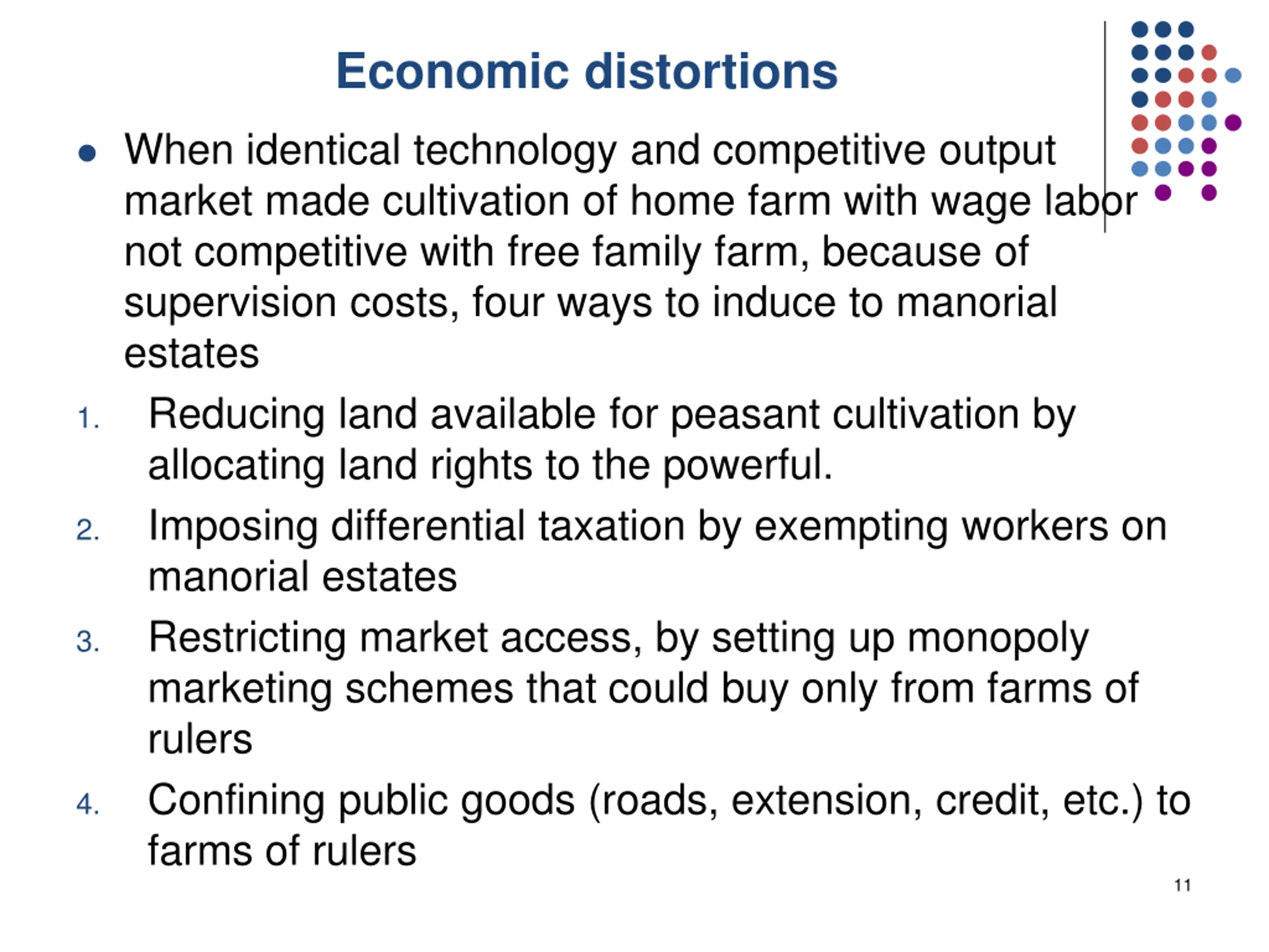 Economic distortions When identical technology and competitive output market made cultivation of home farm with wage labor not competitive with free family farm, because of supervision costs, four ways to induce to manorial estates Reducing land available for peasant cultivation by allocating land rights to the powerful. Imposing differential taxation by exempting workers on manorial estates Restricting market access, by setting up monopoly marketing schemes that could buy only from farms of rulers Confining public goods (roads, extension, credit, etc.) to farms of rulers 1. 2. 3. 4. 11