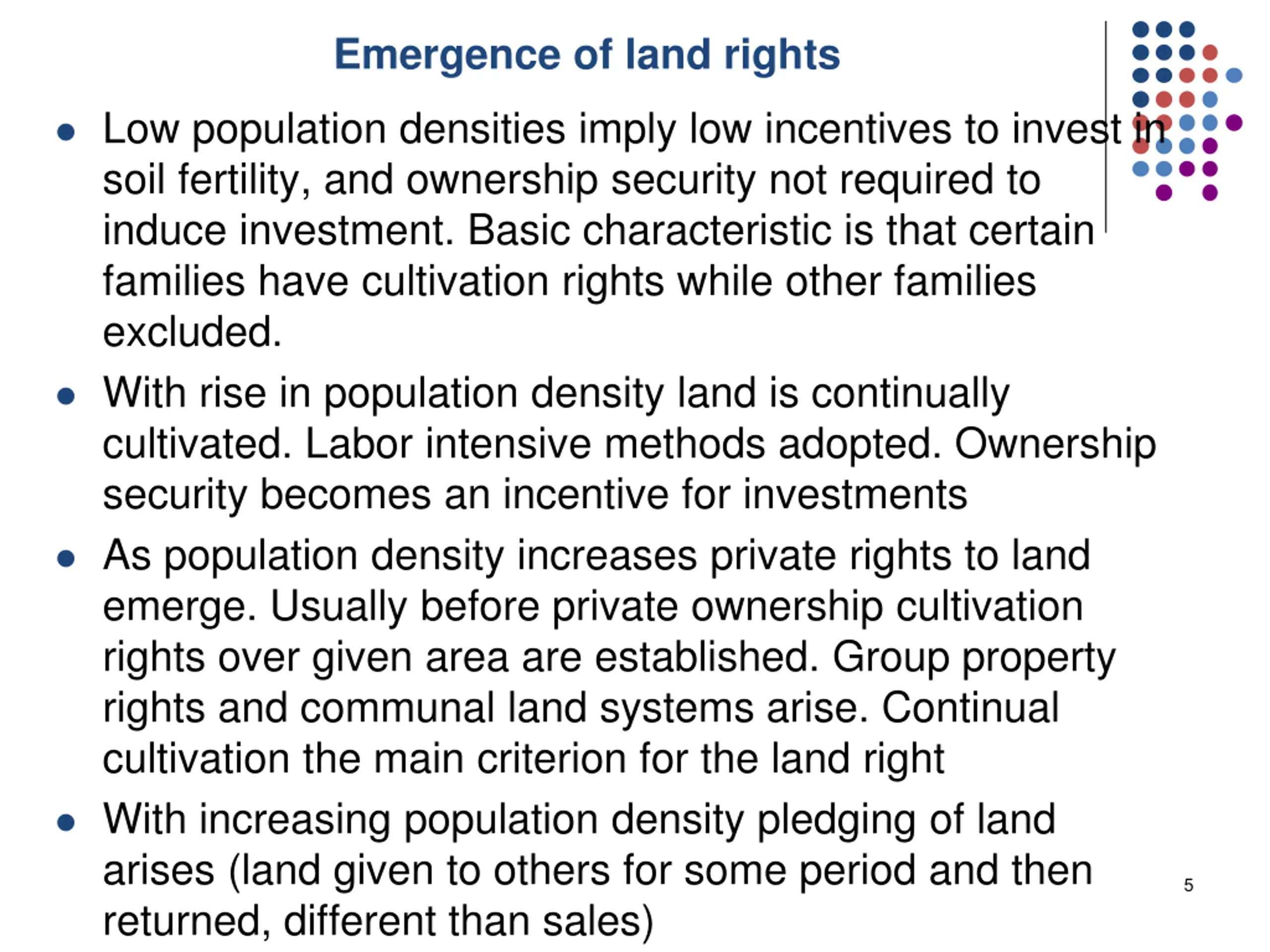 Emergence of land rights Low population densities imply low incentives to invest in soil fertility, and ownership security not required to induce investment. Basic characteristic is that certain families have cultivation rights while other families excluded. With rise in population density land is continually cultivated. Labor intensive methods adopted. Ownership security becomes an incentive for investments As population density increases private rights to land emerge. Usually before private ownership cultivation rights over given area are established. Group property rights and communal land systems arise. Continual cultivation the main criterion for the land right With increasing population density pledging of land arises (land given to others for some period and then returned, different than sales) 5