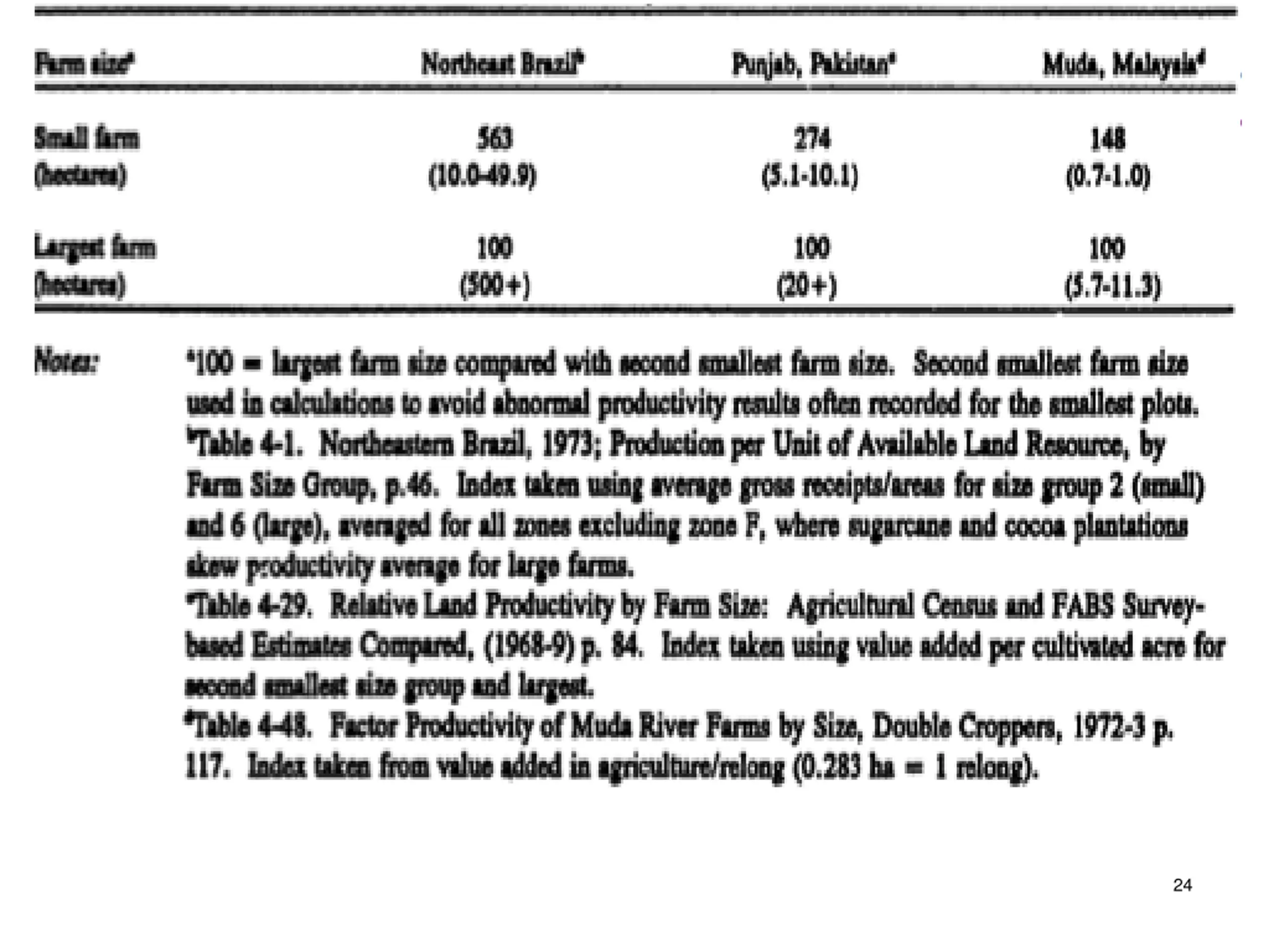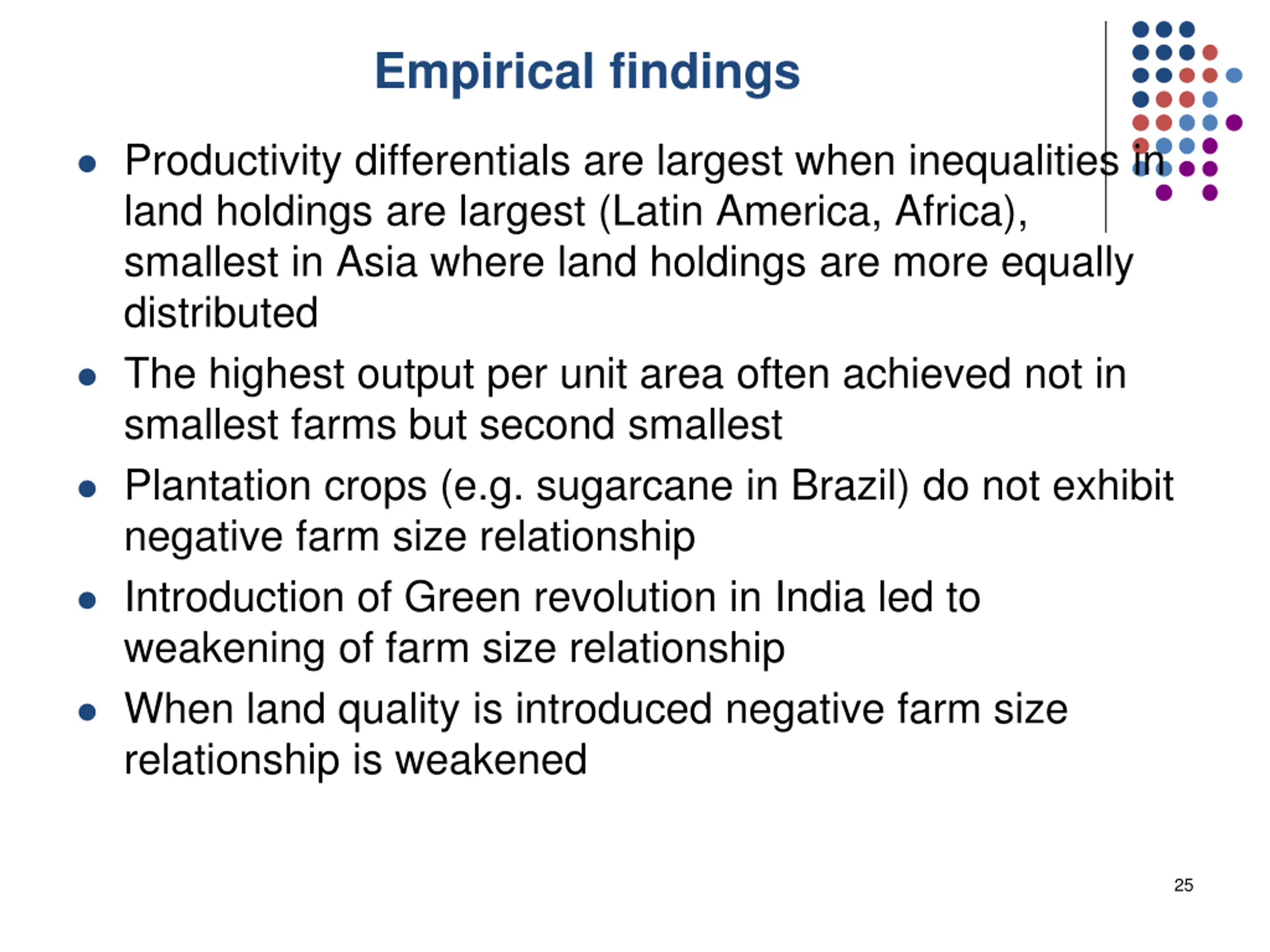 Empirical findings Productivity differentials are largest when inequalities in land holdings are largest (Latin America, Africa), smallest in Asia where land holdings are more equally distributed The highest output per unit area often achieved not in smallest farms but second smallest Plantation crops (e.g. sugarcane in Brazil) do not exhibit negative farm size relationship Introduction of Green revolution in India led to weakening of farm size relationship When land quality is introduced negative farm size relationship is weakened 25