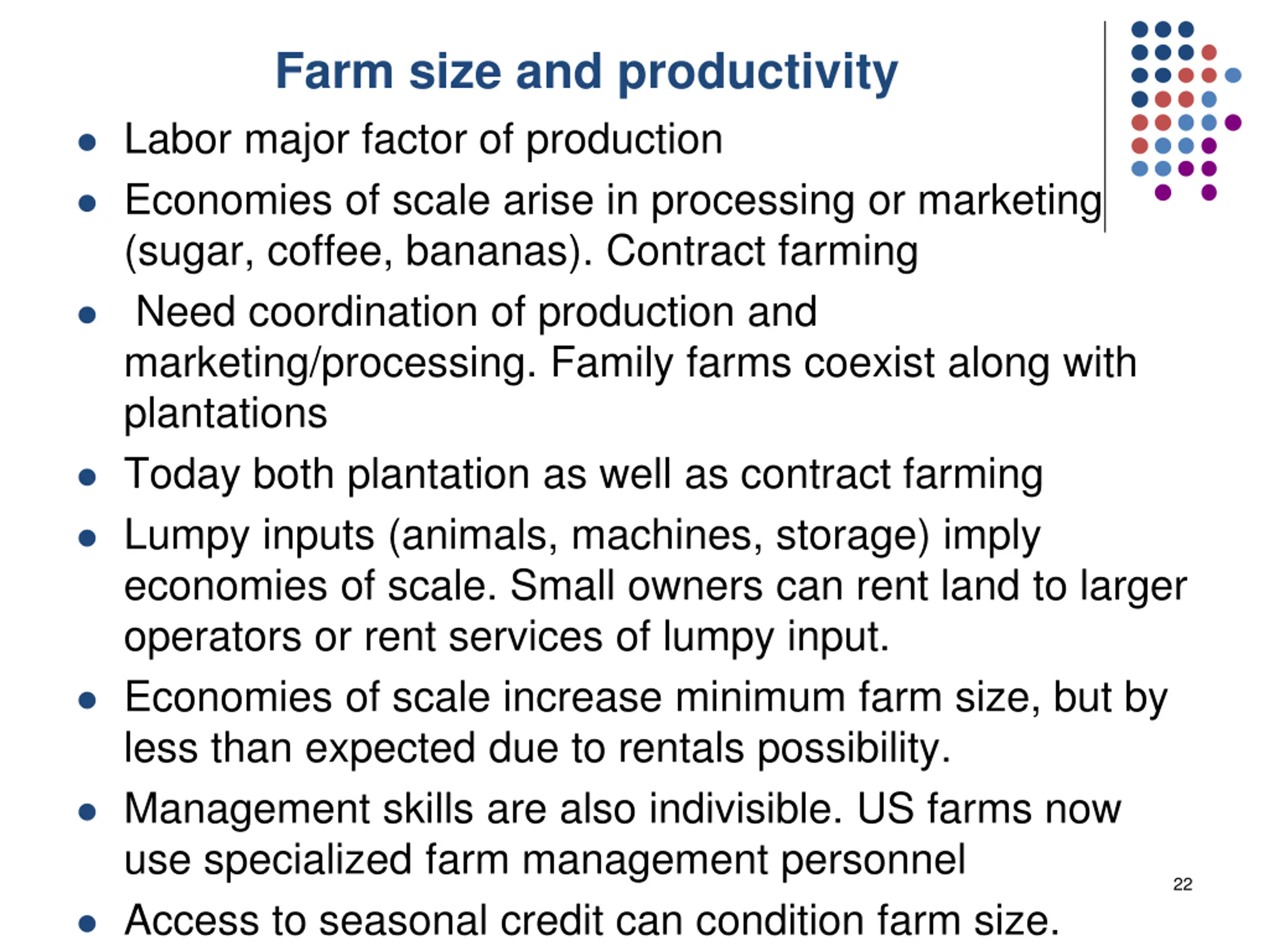 Farm size and productivity Labor major factor of production Economies of scale arise in processing or marketing (sugar, coffee, bananas). Contract farming Need coordination of production and marketing/processing. Family farms coexist along with plantations Today both plantation as well as contract farming Lumpy inputs (animals, machines, storage) imply economies of scale. Small owners can rent land to larger operators or rent services of lumpy input. Economies of scale increase minimum farm size, but by less than expected due to rentals possibility. Management skills are also indivisible. US farms now use specialized farm management personnel Access to seasonal credit can condition farm size. 22