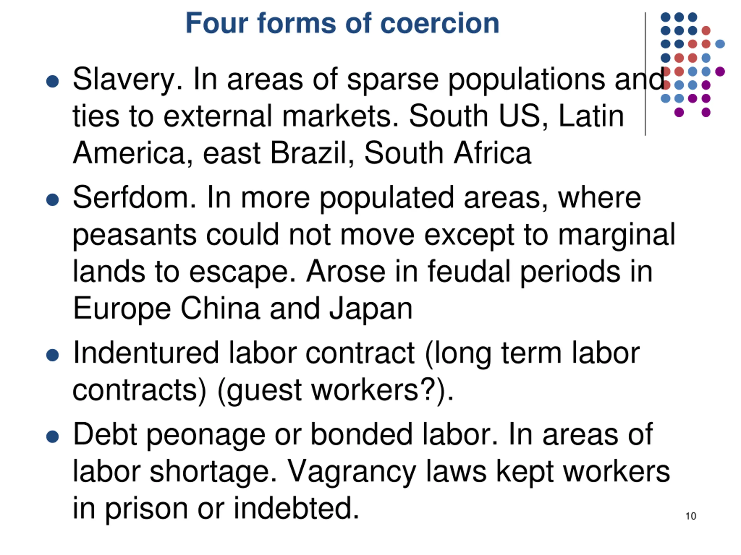 Four forms of coercion Slavery. In areas of sparse populations and ties to external markets. South US, Latin America, east Brazil, South Africa Serfdom. In more populated areas, where peasants could not move except to marginal lands to escape. Arose in feudal periods in Europe China and Japan Indentured labor contract (long term labor contracts) (guest workers?). Debt peonage or bonded labor. In areas of labor shortage. Vagrancy laws kept workers in prison or indebted. 10