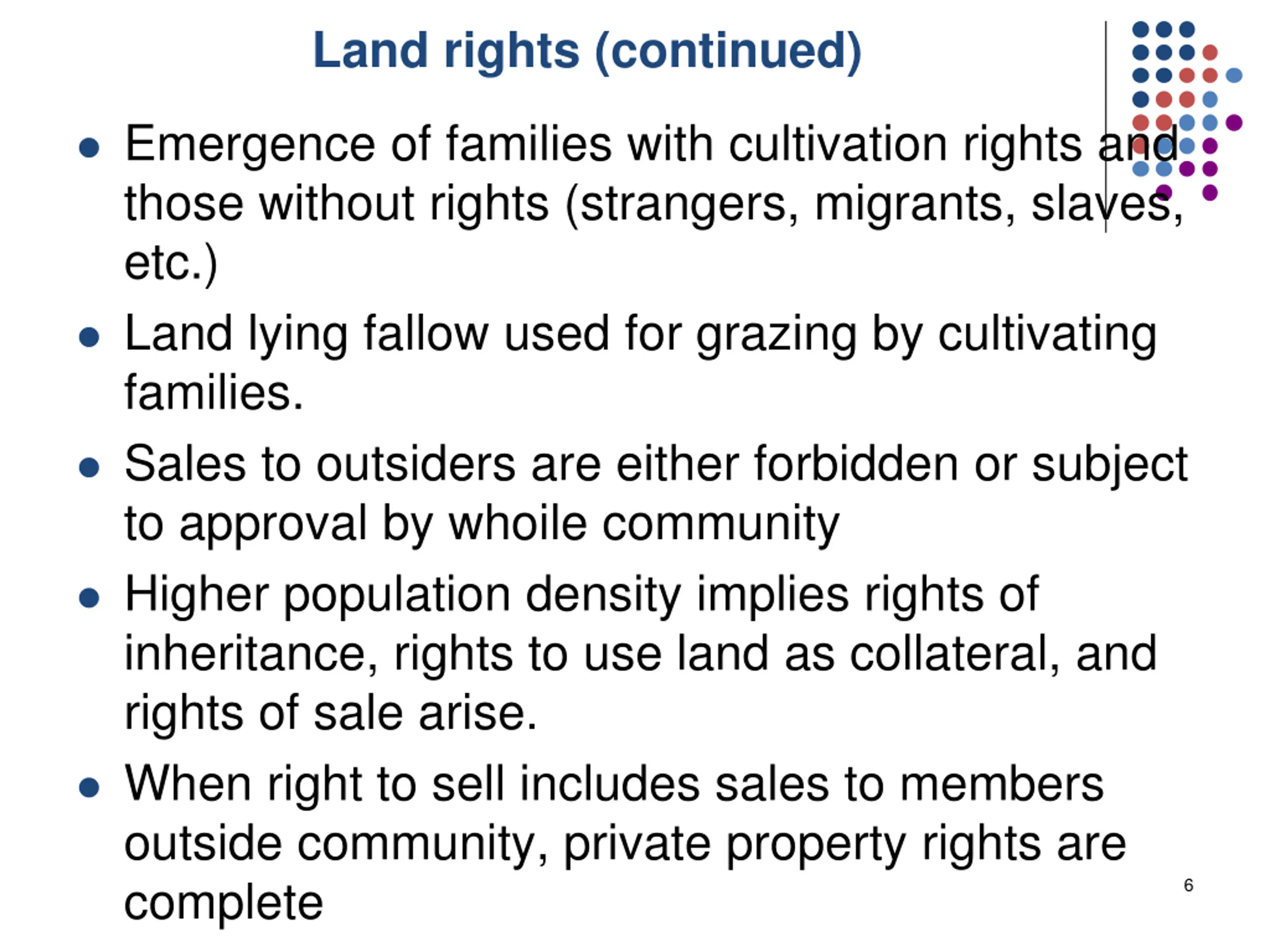 Land rights (continued) Emergence of families with cultivation rights and those without rights (strangers, migrants, slaves, etc.) Land lying fallow used for grazing by cultivating families. Sales to outsiders are either forbidden or subject to approval by whoile community Higher population density implies rights of inheritance, rights to use land as collateral, and rights of sale arise. When right to sell includes sales to members outside community, private property rights are complete 6