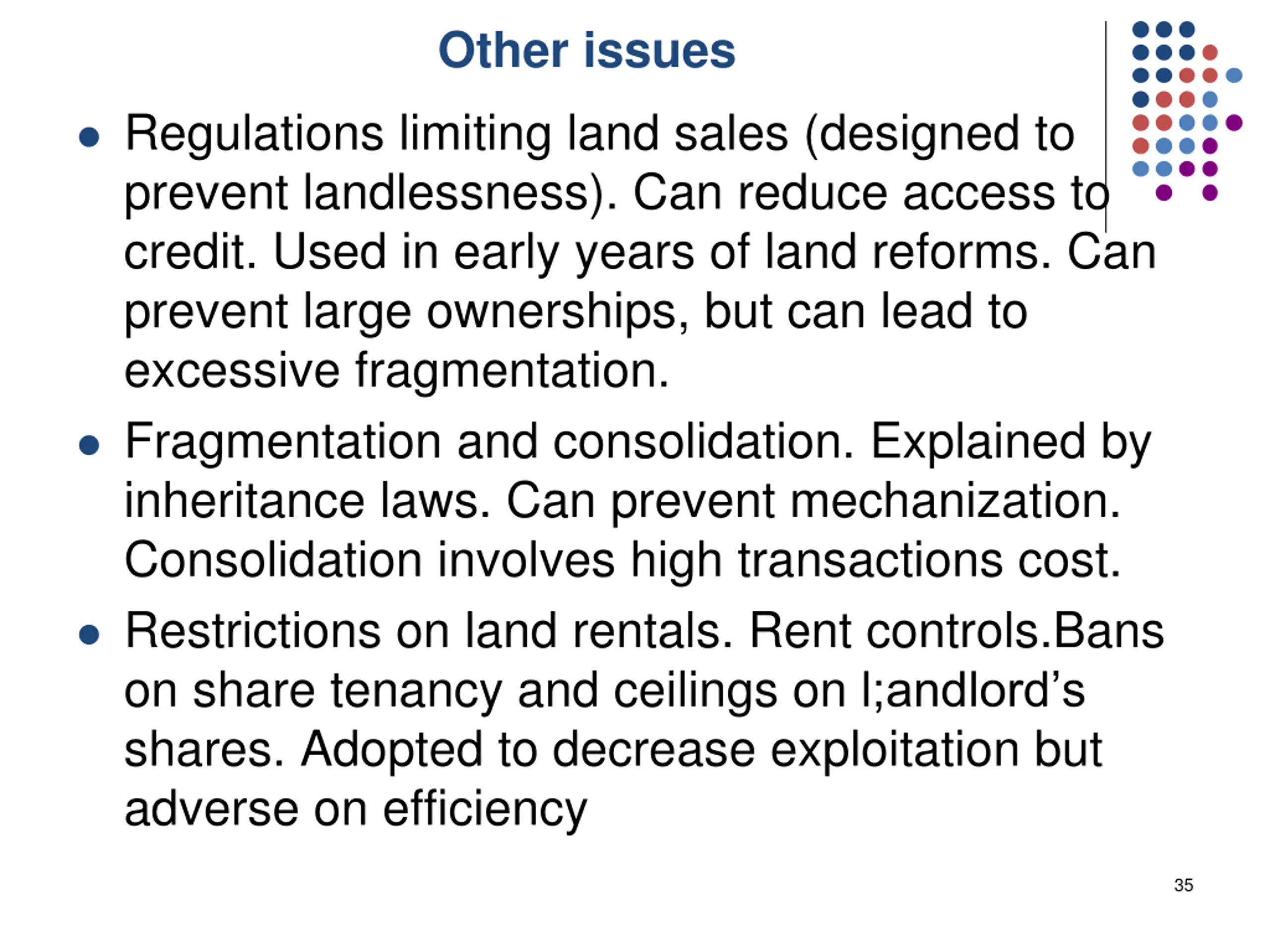 Other issues Regulations limiting land sales (designed to prevent landlessness). Can reduce access to credit. Used in early years of land reforms. Can prevent large ownerships, but can lead to excessive fragmentation. Fragmentation and consolidation. Explained by inheritance laws. Can prevent mechanization. Consolidation involves high transactions cost. Restrictions on land rentals. Rent controls.Bans on share tenancy and ceilings on l;andlord s shares. Adopted to decrease exploitation but adverse on efficiency 35