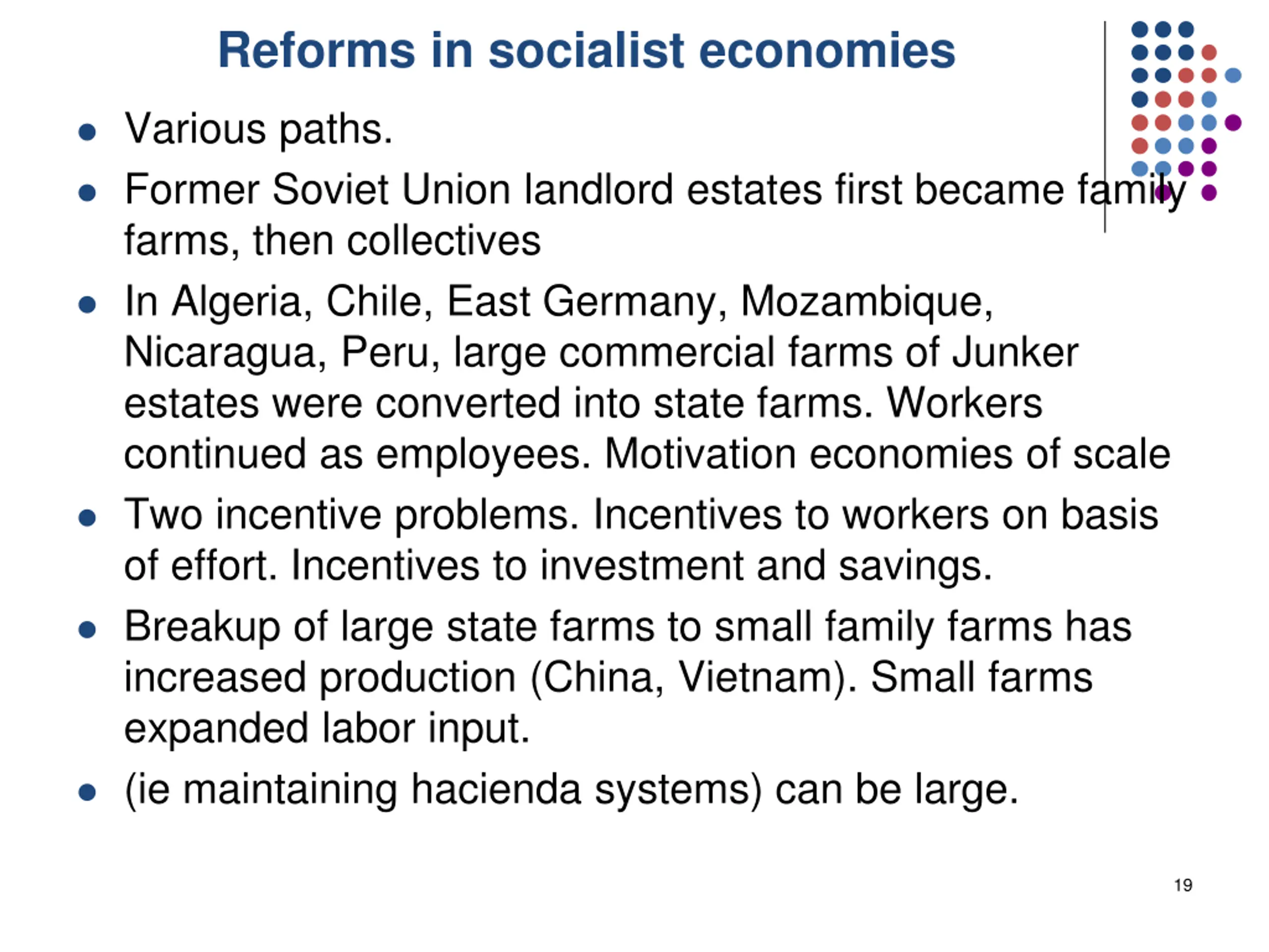 Reforms in socialist economies Various paths. Former Soviet Union landlord estates first became family farms, then collectives In Algeria, Chile, East Germany, Mozambique, Nicaragua, Peru, large commercial farms of Junker estates were converted into state farms. Workers continued as employees. Motivation economies of scale Two incentive problems. Incentives to workers on basis of effort. Incentives to investment and savings. Breakup of large state farms to small family farms has increased production (China, Vietnam). Small farms expanded labor input. (ie maintaining hacienda systems) can be large. 19