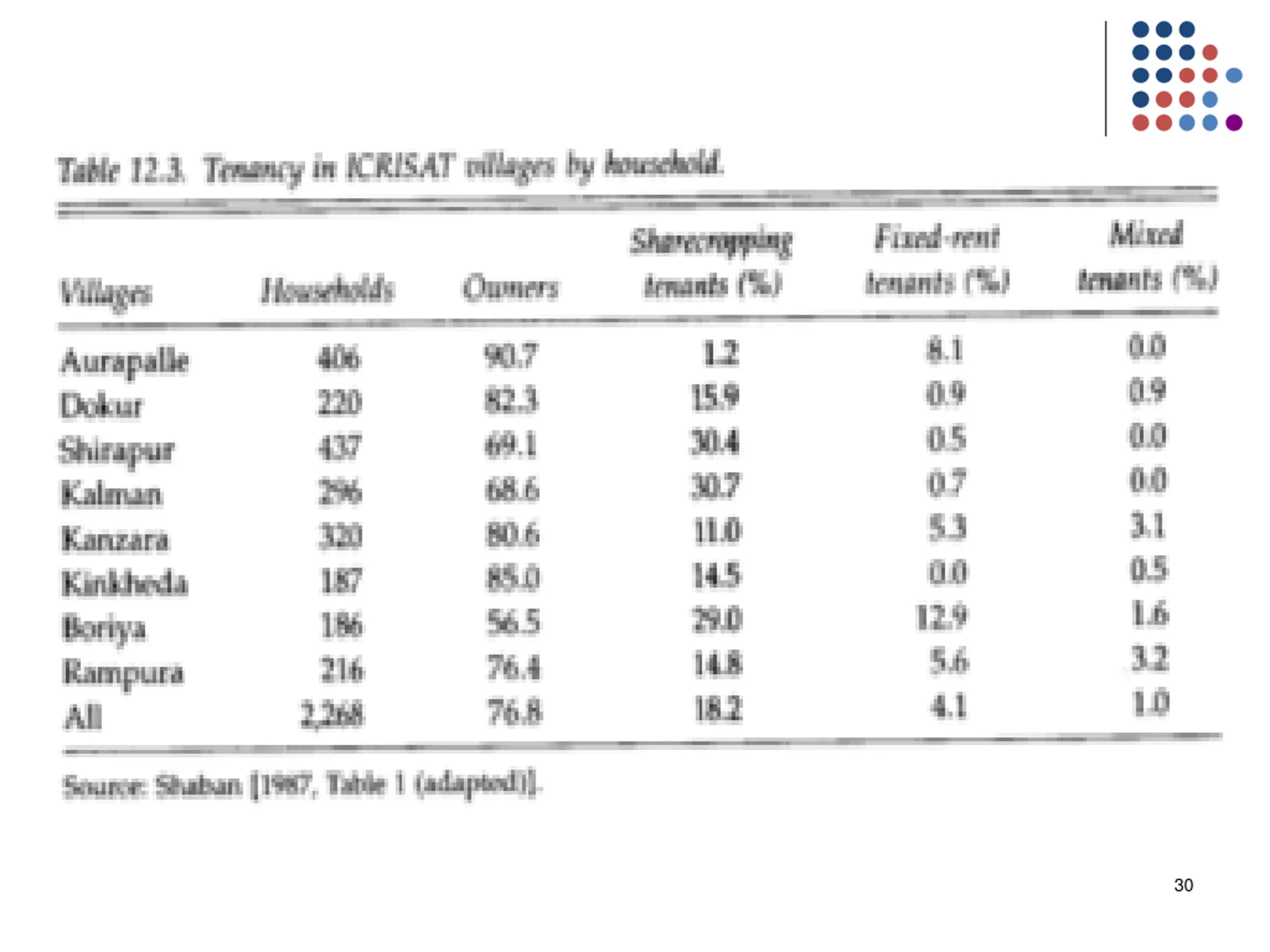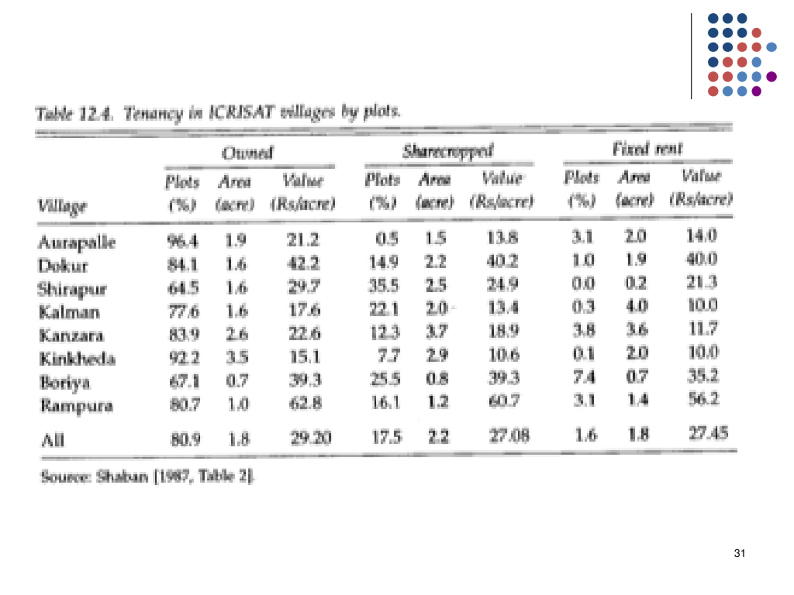 Can land rental markets increase efficiency Is share tenancy inefficient? Under certainty form of rental does not matter Under uncertainty it does Choice of contract a bargaining problem Important is to consider incentives 32
