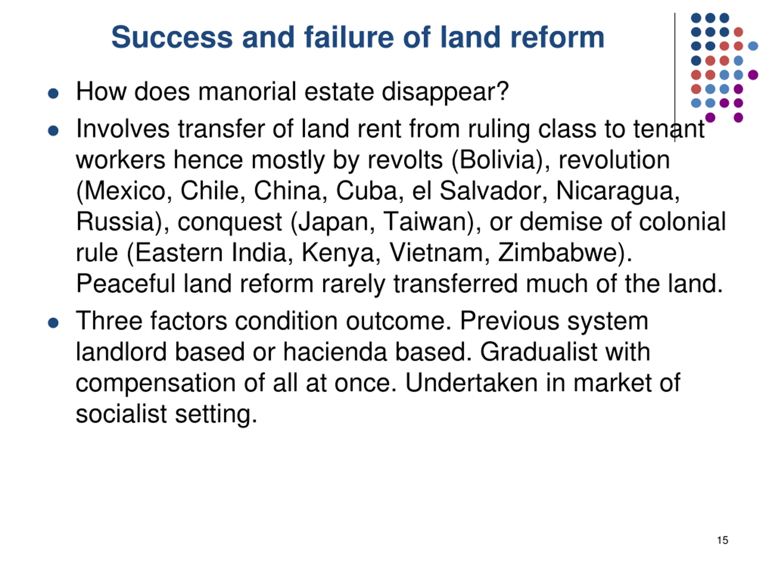 Success and failure of land reform How does manorial estate disappear? Involves transfer of land rent from ruling class to tenant workers hence mostly by revolts (Bolivia), revolution (Mexico, Chile, China, Cuba, el Salvador, Nicaragua, Russia), conquest (Japan, Taiwan), or demise of colonial rule (Eastern India, Kenya, Vietnam, Zimbabwe). Peaceful land reform rarely transferred much of the land. Three factors condition outcome. Previous system landlord based or hacienda based. Gradualist with compensation of all at once. Undertaken in market of socialist setting. 15