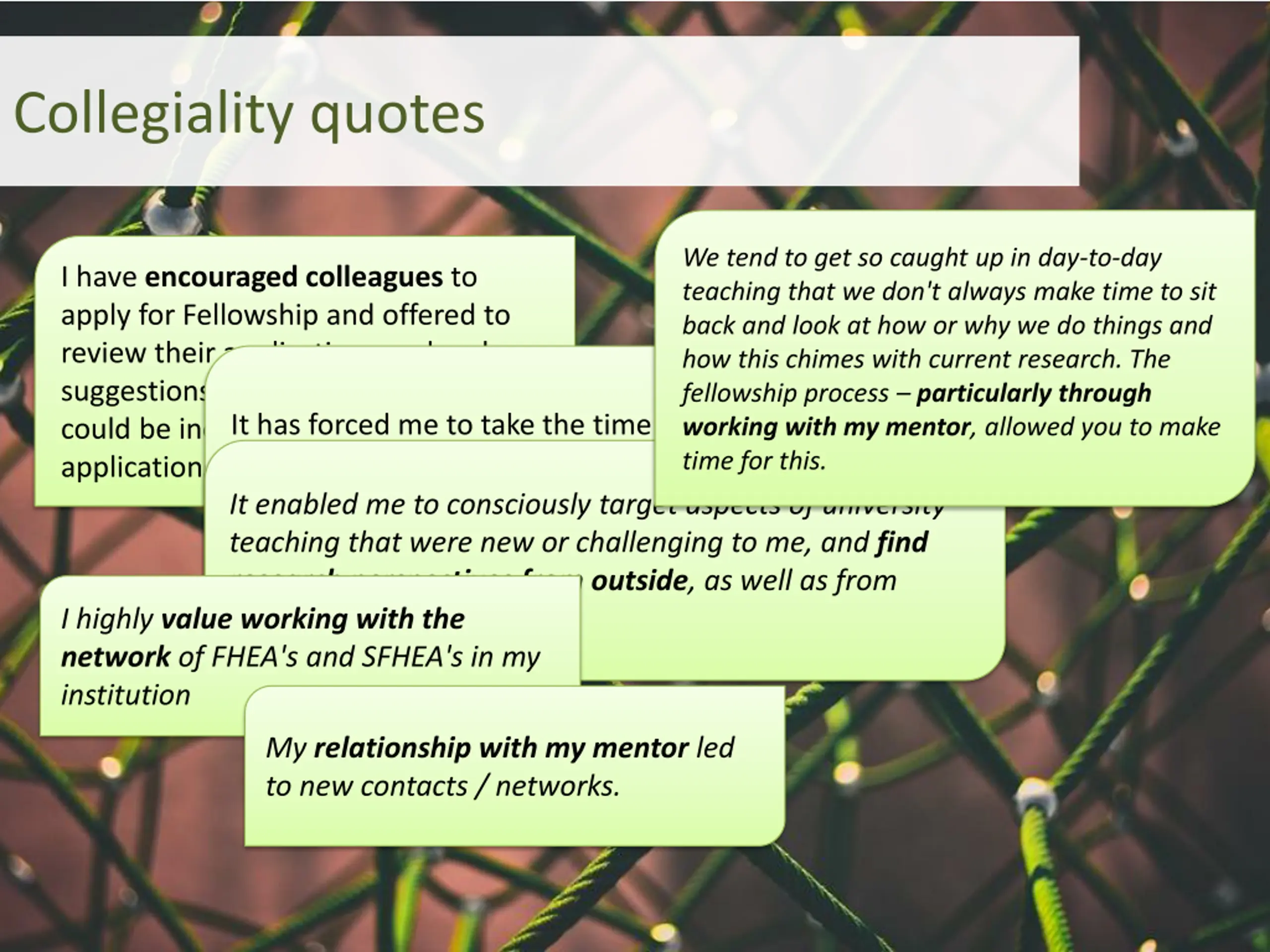 Collegiality quotes We tend to get so caught up in day-to-day teaching that we don't always make time to sit back and look at how or why we do things and how this chimes with current research. The fellowship process particularly through working with my mentor, allowed you to make time for this. I have encouraged colleagues to apply for Fellowship and offered to review their applications and make suggestions of their practice that could be included in their applications. reflect on my learning and teaching and, more importantly, to discuss this with my peers. teaching that were new or challenging to me, and find research perspectives from outside, as well as from within my artistic practice I highly value working with the network of FHEA's and SFHEA's in my institution It has forced me to take the time to It enabled me to consciously target aspects of university My relationship with my mentor led to new contacts / networks.