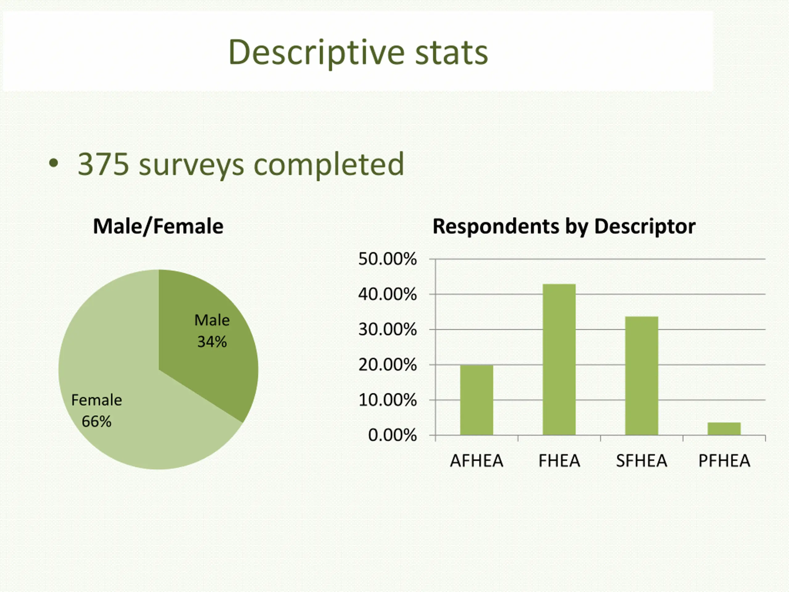 Descriptive stats 375 surveys completed Male/Female Respondents by Descriptor 50.00% 40.00% Male 34% 30.00% 20.00% 10.00% Female 66% 0.00% AFHEA FHEA SFHEA PFHEA