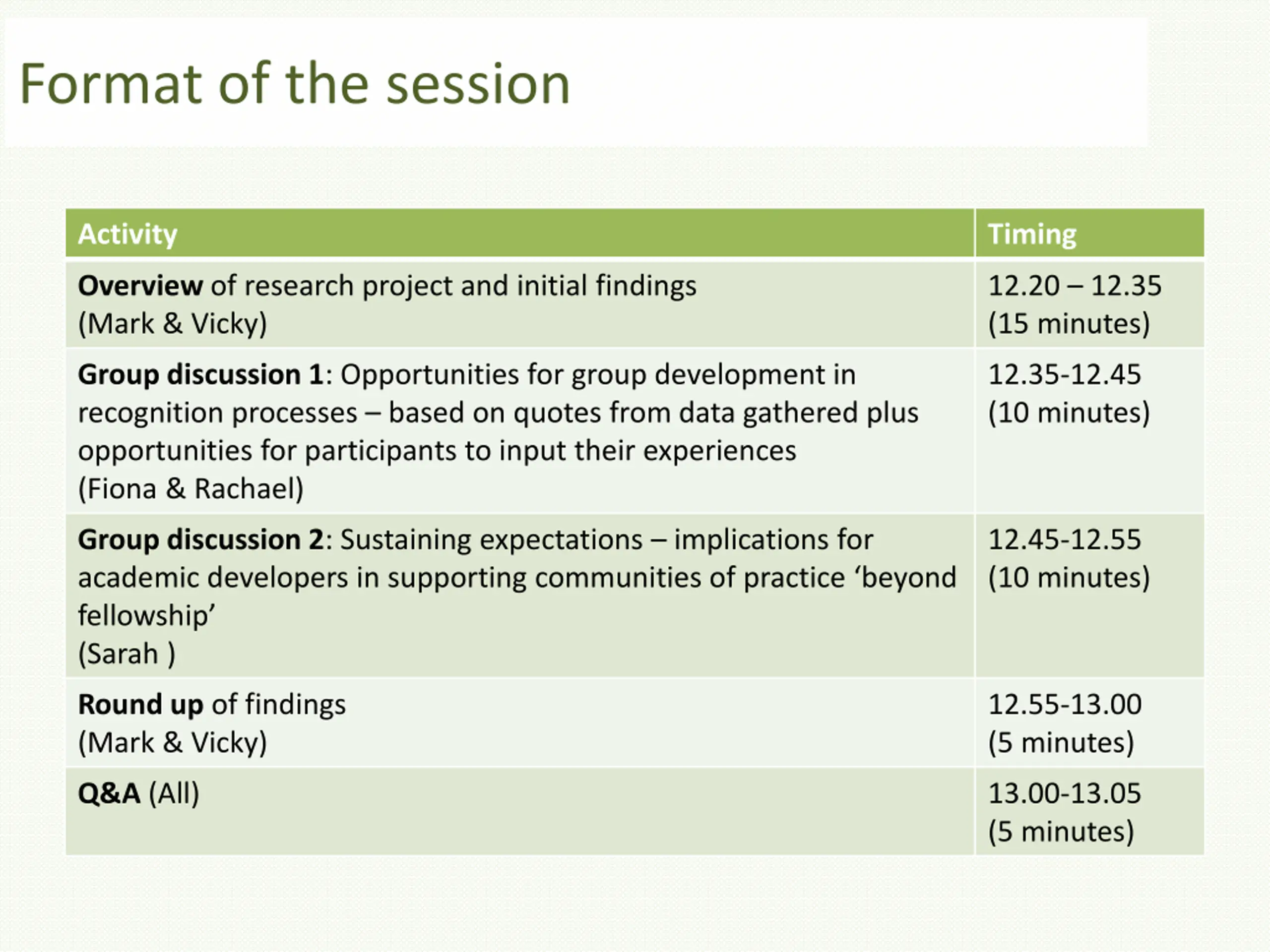 Format of the session Activity Timing Overview of research project and initial findings (Mark & Vicky) 12.20 12.35 (15 minutes) Group discussion 1: Opportunities for group development in recognition processes based on quotes from data gathered plus opportunities for participants to input their experiences (Fiona & Rachael) 12.35-12.45 (10 minutes) Group discussion 2: Sustaining expectations implications for academic developers in supporting communities of practice beyond fellowship (Sarah ) 12.45-12.55 (10 minutes) Round up of findings (Mark & Vicky) 12.55-13.00 (5 minutes) Q&A (All) 13.00-13.05 (5 minutes)