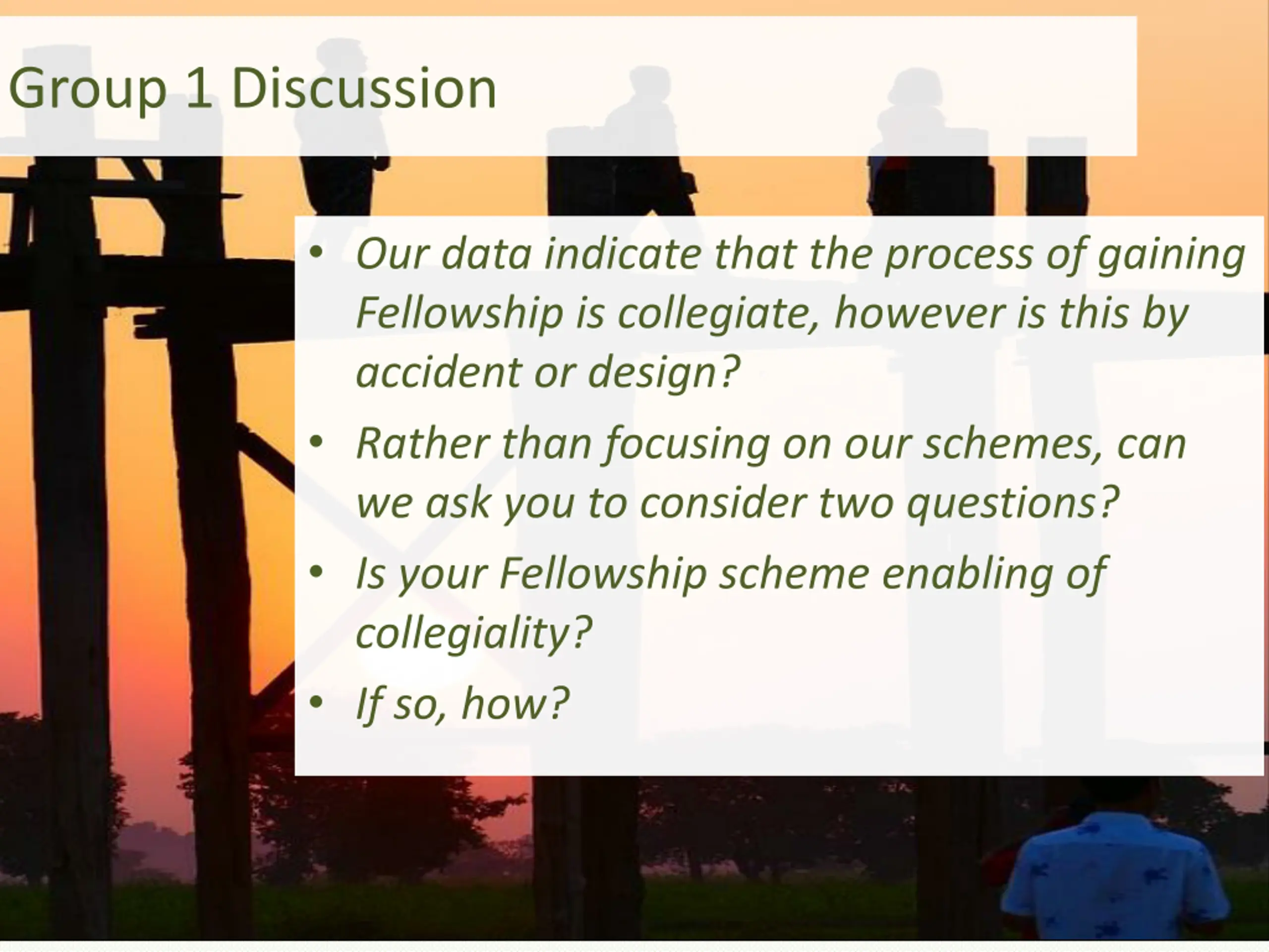 Group 1 Discussion Our data indicate that the process of gaining Fellowship is collegiate, however is this by accident or design? Rather than focusing on our schemes, can we ask you to consider two questions? Is your Fellowship scheme enabling of collegiality? If so, how?