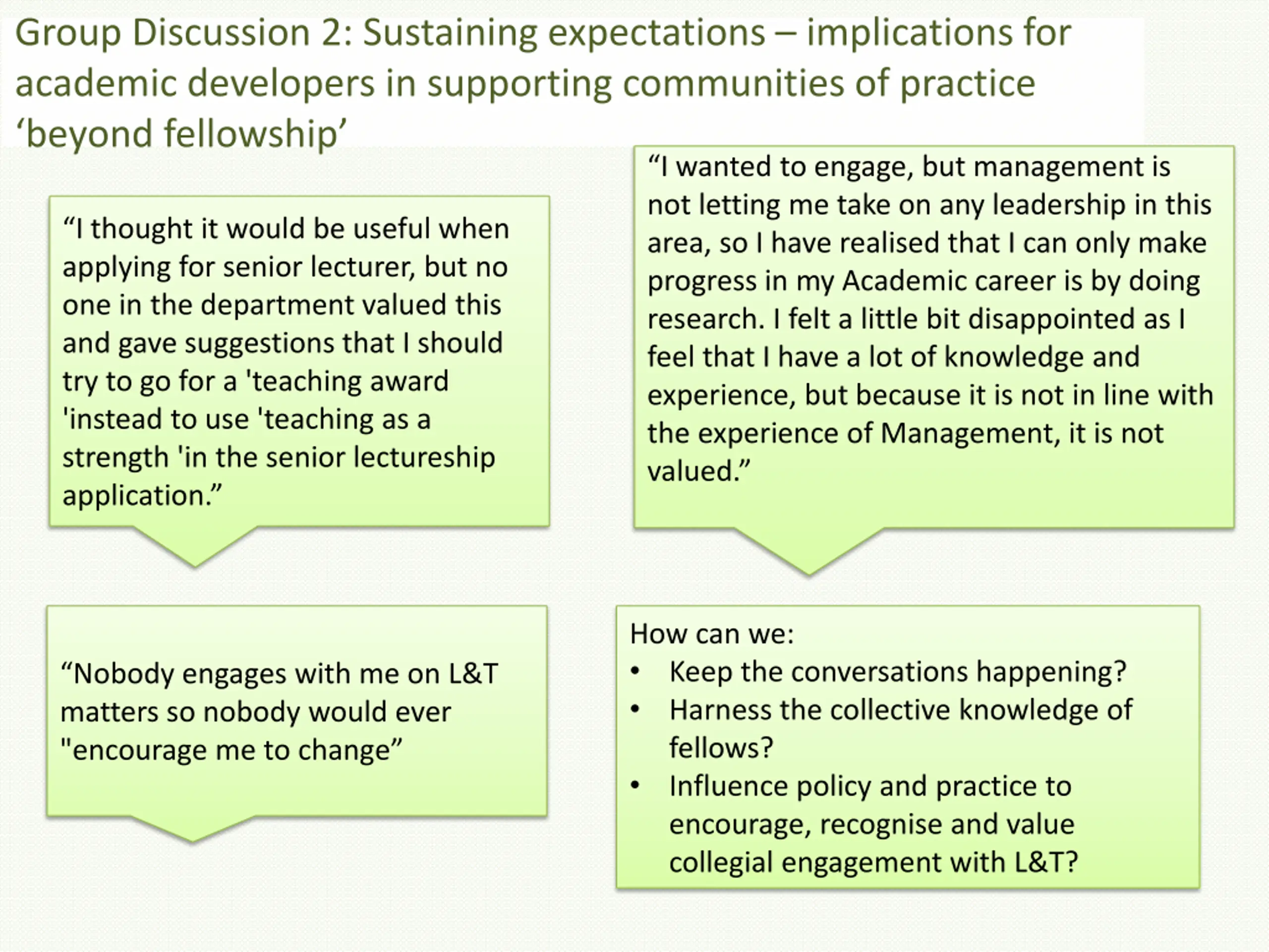Group Discussion 2: Sustaining expectations implications for academic developers in supporting communities of practice beyond fellowship I wanted to engage, but management is not letting me take on any leadership in this area, so I have realised that I can only make progress in my Academic career is by doing research. I felt a little bit disappointed as I feel that I have a lot of knowledge and experience, but because it is not in line with the experience of Management, it is not valued. I thought it would be useful when applying for senior lecturer, but no one in the department valued this and gave suggestions that I should try to go for a 'teaching award 'instead to use 'teaching as a strength 'in the senior lectureship application. How can we: Keep the conversations happening? Harness the collective knowledge of fellows? Influence policy and practice to encourage, recognise and value collegial engagement with L&T? Nobody engages with me on L&T matters so nobody would ever "encourage me to change