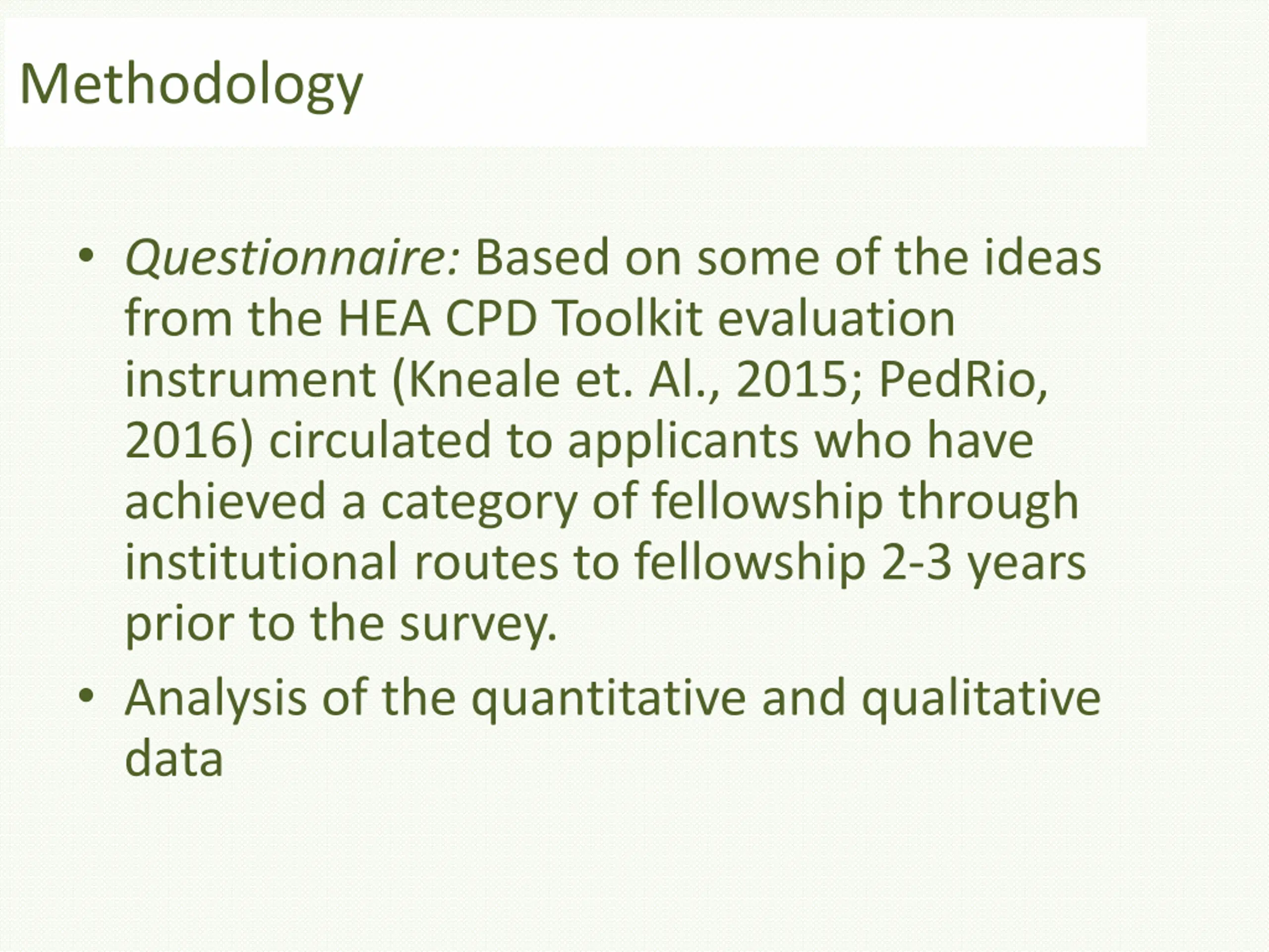 Methodology Questionnaire: Based on some of the ideas from the HEA CPD Toolkit evaluation instrument (Kneale et. Al., 2015; PedRio, 2016) circulated to applicants who have achieved a category of fellowship through institutional routes to fellowship 2-3 years prior to the survey. Analysis of the quantitative and qualitative data