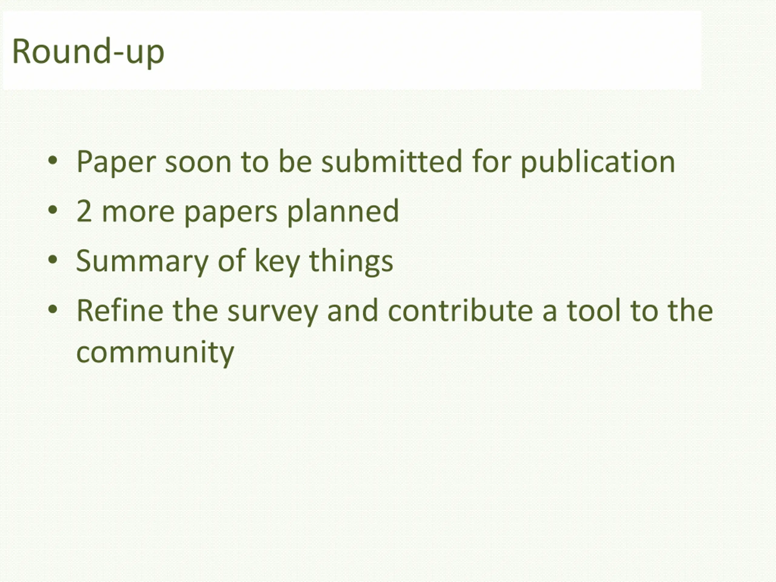 Round-up Paper soon to be submitted for publication 2 more papers planned Summary of key things Refine the survey and contribute a tool to the community