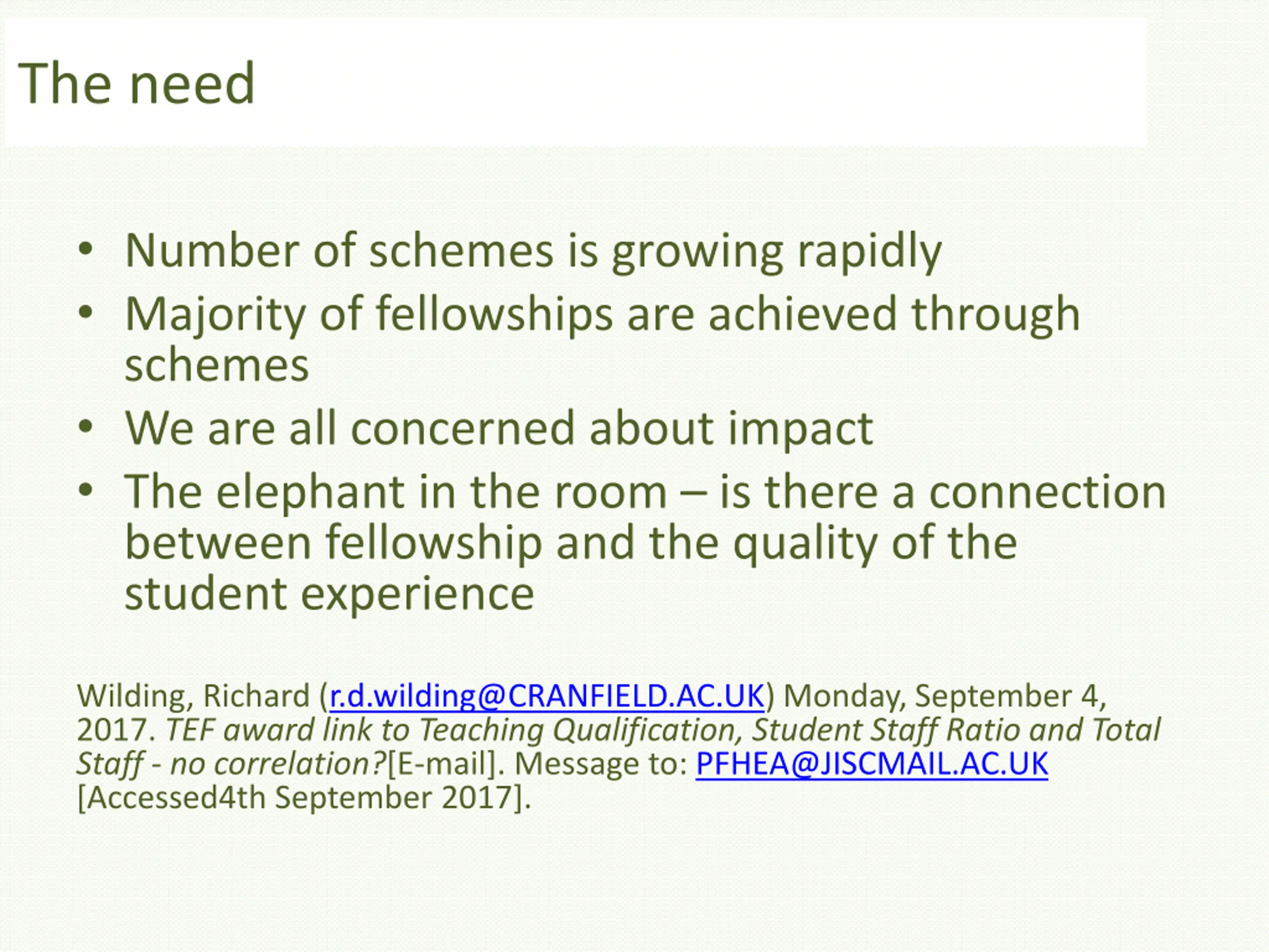 The need Number of schemes is growing rapidly Majority of fellowships are achieved through schemes We are all concerned about impact The elephant in the room is there a connection between fellowship and the quality of the student experience Wilding, Richard (r.d.wilding@CRANFIELD.AC.UK) Monday, September 4, 2017. TEF award link to Teaching Qualification, Student Staff Ratio and Total Staff - no correlation?[E-mail]. Message to: PFHEA@JISCMAIL.AC.UK [Accessed4th September 2017].