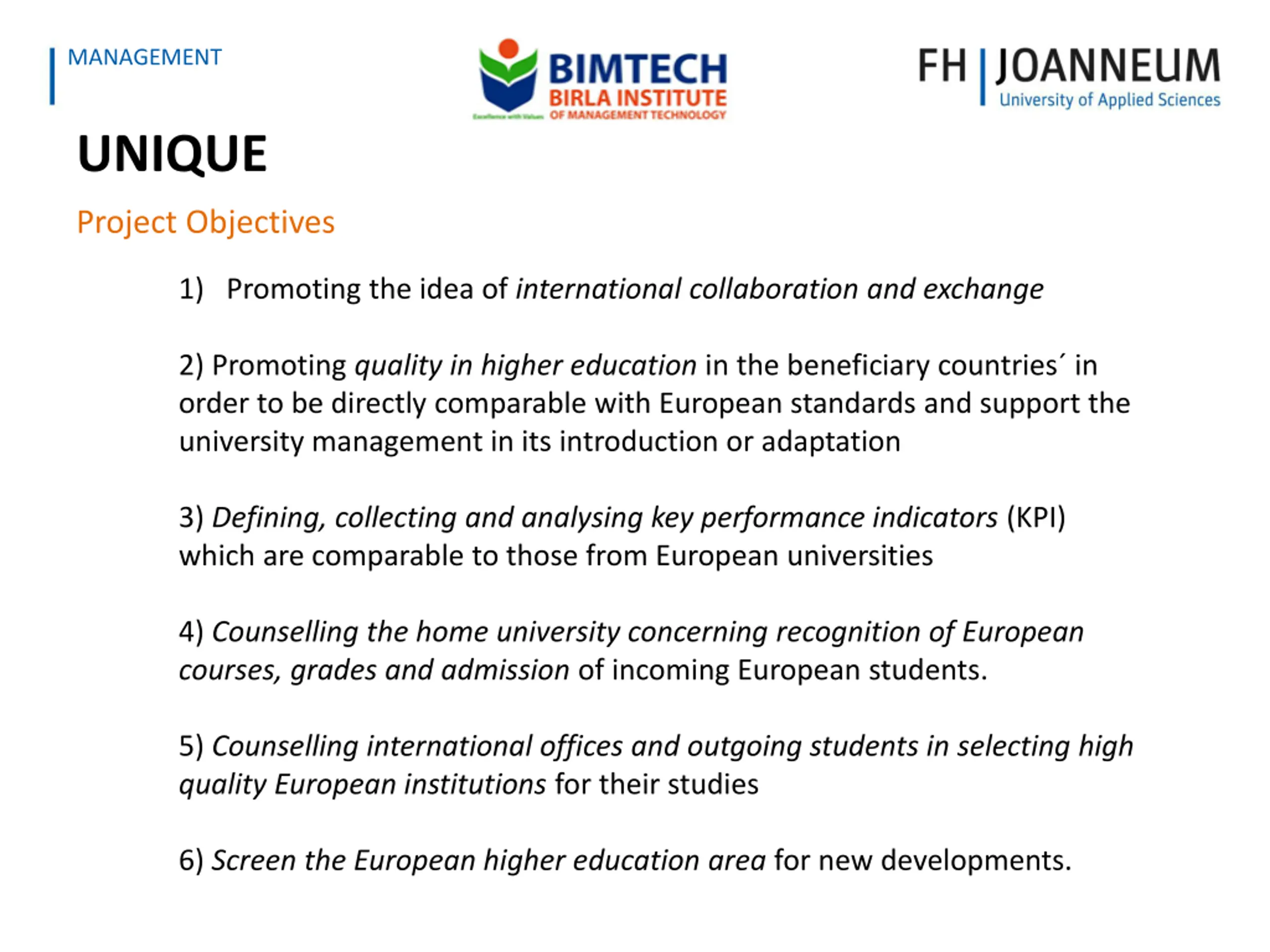 www.fh-joanneum.at MANAGEMENT UNIQUE Project Objectives 1) Promoting the idea of international collaboration and exchange 2) Promoting quality in higher education in the beneficiary countries in order to be directly comparable with European standards and support the university management in its introduction or adaptation 3) Defining, collecting and analysing key performance indicators (KPI) which are comparable to those from European universities 4) Counselling the home university concerning recognition of European courses, grades and admission of incoming European students. 5) Counselling international offices and outgoing students in selecting high quality European institutions for their studies 6) Screen the European higher education area for new developments.