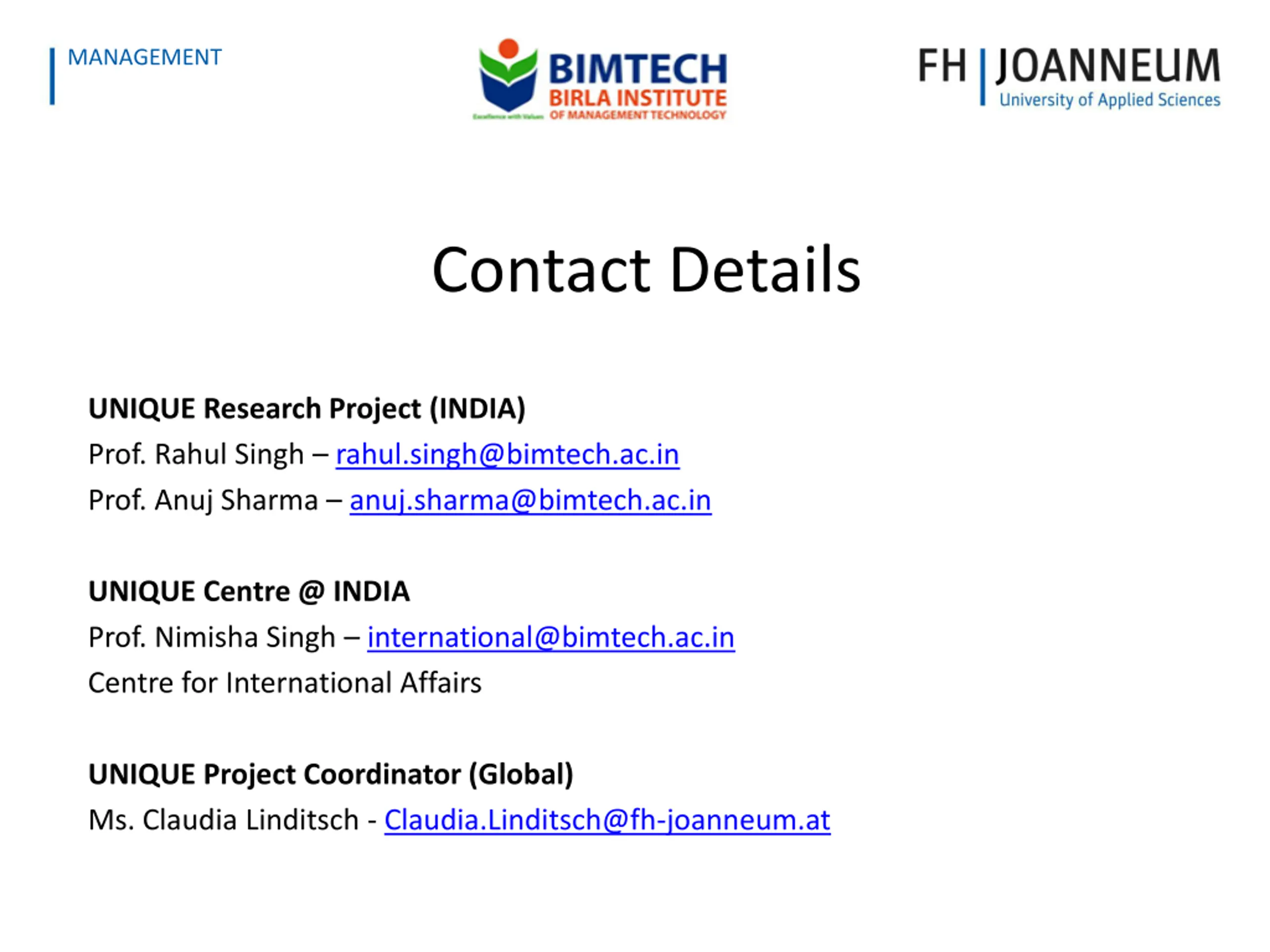 www.fh-joanneum.at MANAGEMENT Contact Details UNIQUE Research Project (INDIA) Prof. Rahul Singh rahul.singh@bimtech.ac.in Prof. Anuj Sharma anuj.sharma@bimtech.ac.in UNIQUE Centre @ INDIA Prof. Nimisha Singh international@bimtech.ac.in Centre for International Affairs UNIQUE Project Coordinator (Global) Ms. Claudia Linditsch - Claudia.Linditsch@fh-joanneum.at