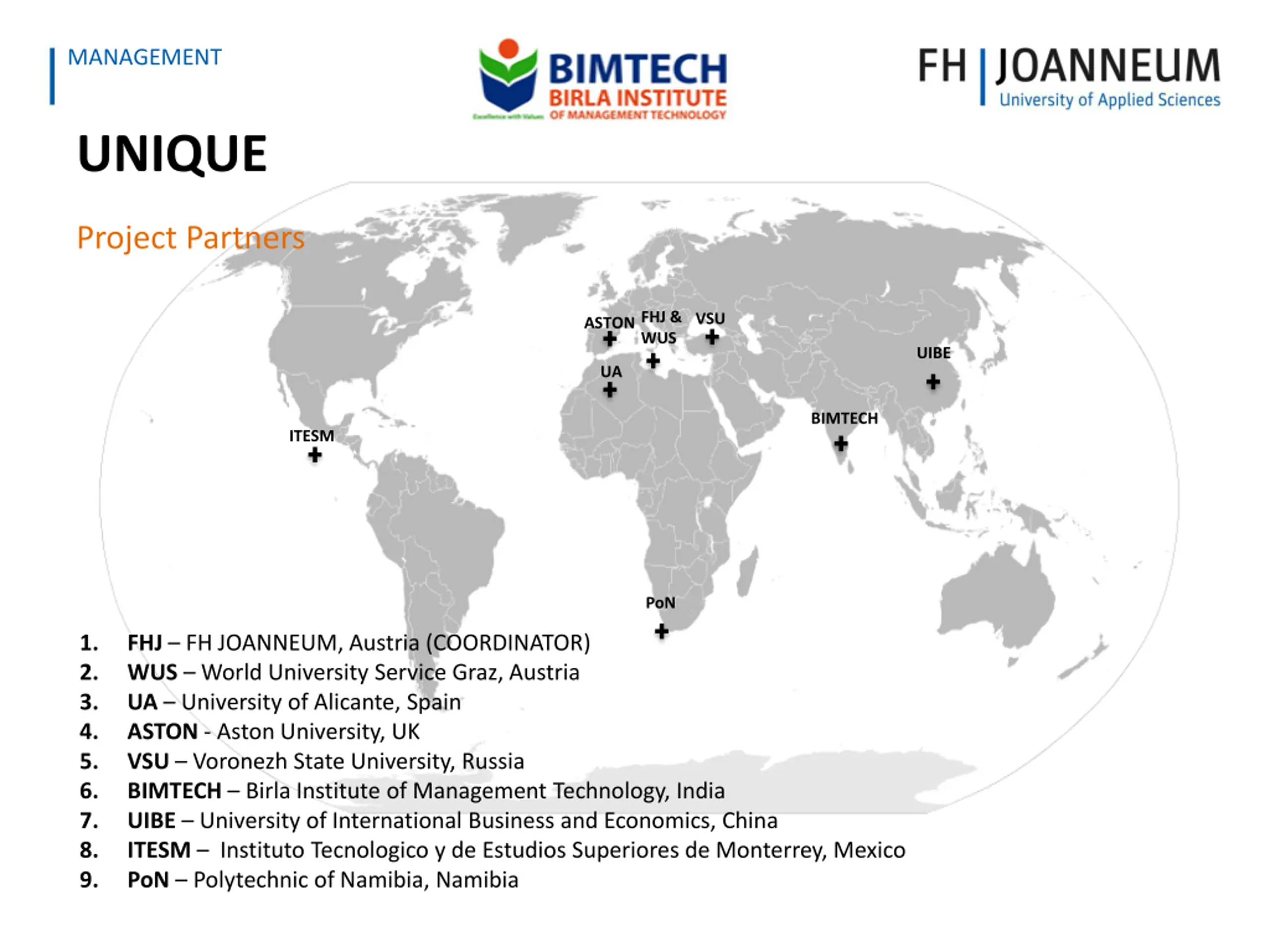 www.fh-joanneum.at MANAGEMENT UNIQUE Project Partners FHJ & WUS VSU ASTON UIBE UA BIMTECH ITESM PoN 1. 2. 3. 4. 5. 6. 7. 8. 9. FHJ FH JOANNEUM, Austria (COORDINATOR) WUS World University Service Graz, Austria UA University of Alicante, Spain ASTON - Aston University, UK VSU Voronezh State University, Russia BIMTECH Birla Institute of Management Technology, India UIBE University of International Business and Economics, China ITESM Instituto Tecnologico y de Estudios Superiores de Monterrey, Mexico PoN Polytechnic of Namibia, Namibia