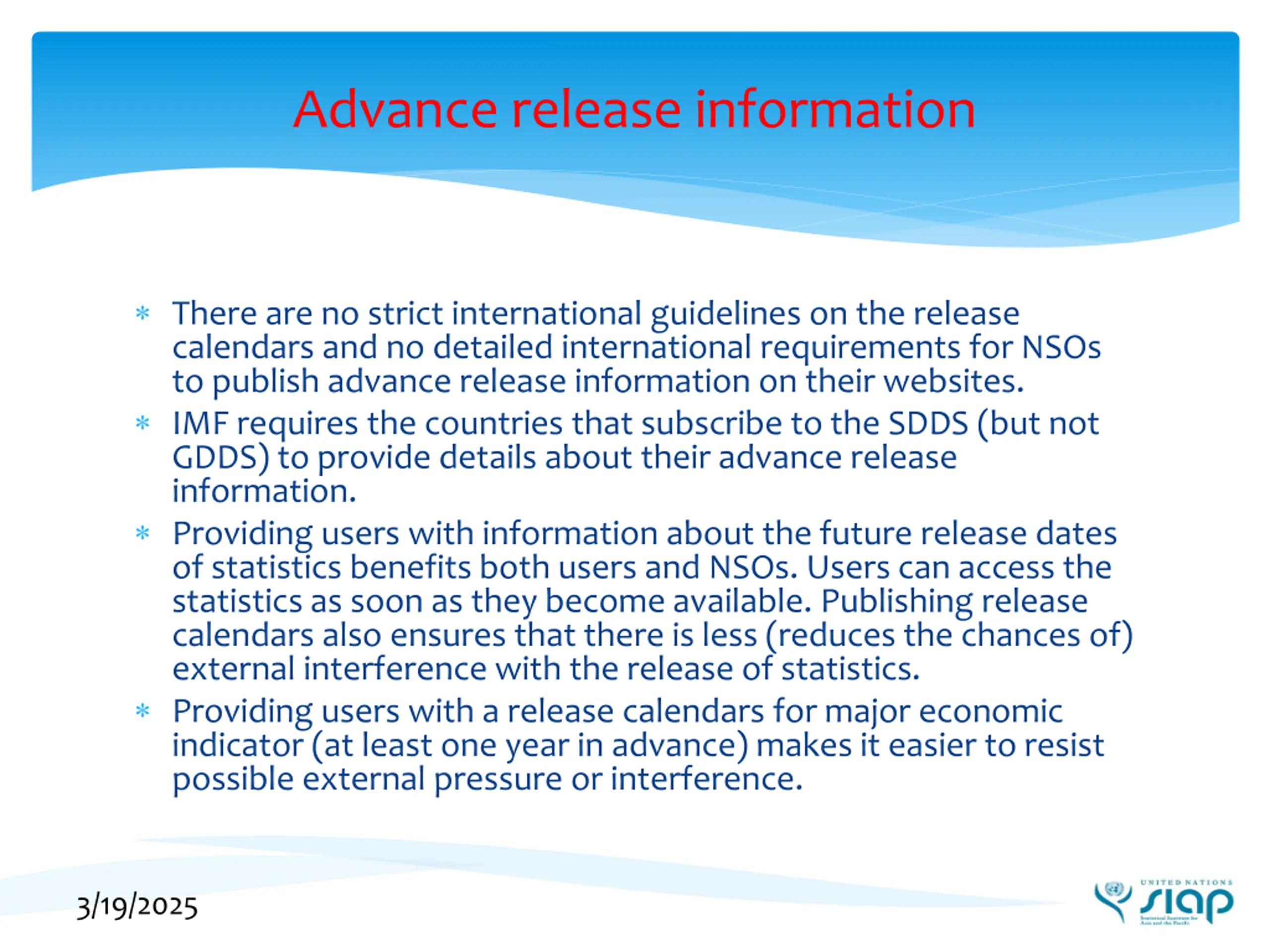 Advance release information There are no strict international guidelines on the release calendars and no detailed international requirements for NSOs to publish advance release information on their websites. IMF requires the countries that subscribe to the SDDS (but not GDDS) to provide details about their advance release information. Providing users with information about the future release dates of statistics benefits both users and NSOs. Users can access the statistics as soon as they become available. Publishing release calendars also ensures that there is less (reduces the chances of) external interference with the release of statistics. Providing users with a release calendars for major economic indicator (at least one year in advance) makes it easier to resist possible external pressure or interference. 3/19/2025