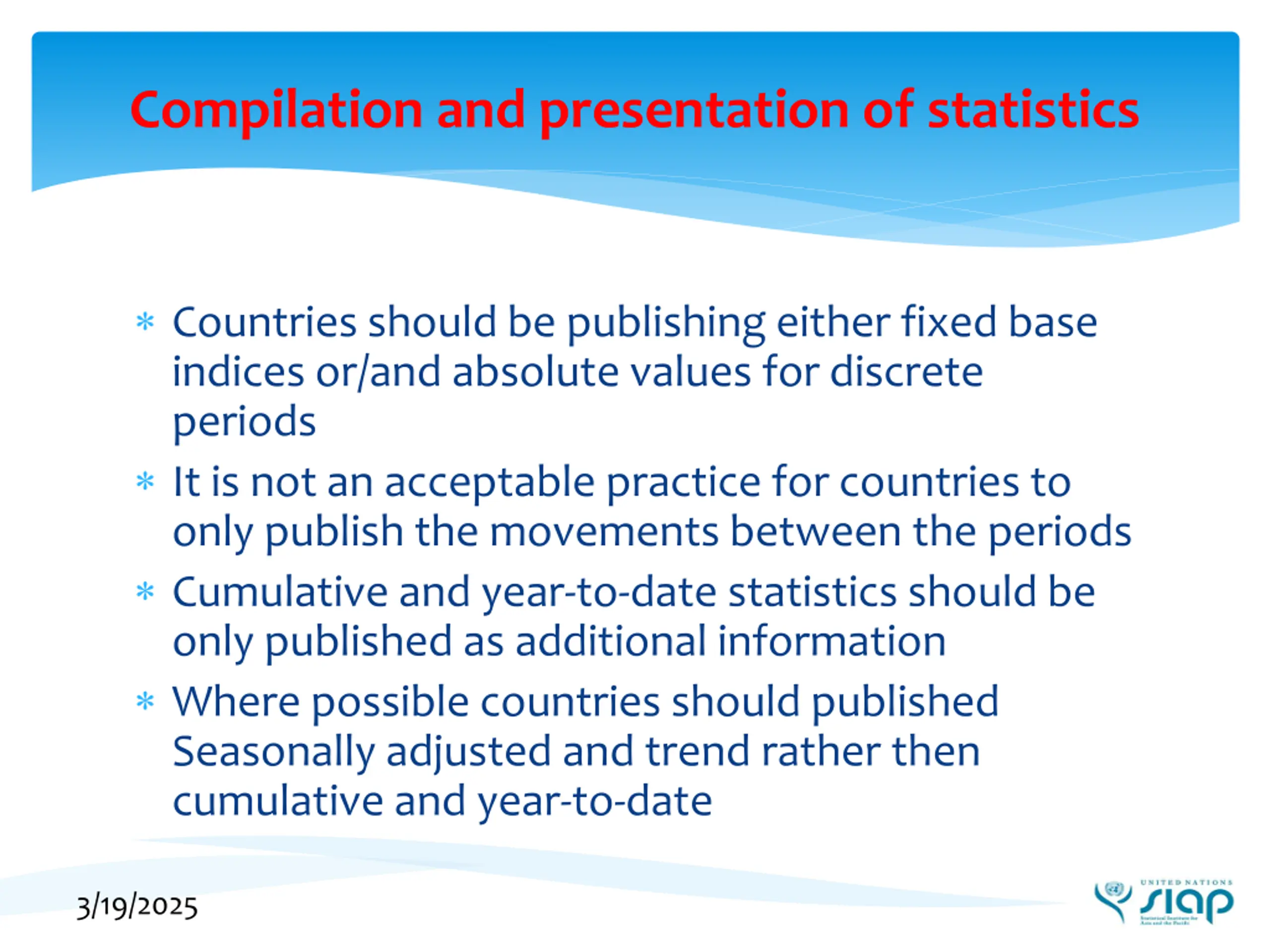 Compilation and presentation of statistics Countries should be publishing either fixed base indices or/and absolute values for discrete periods It is not an acceptable practice for countries to only publish the movements between the periods Cumulative and year-to-date statistics should be only published as additional information Where possible countries should published Seasonally adjusted and trend rather then cumulative and year-to-date 3/19/2025