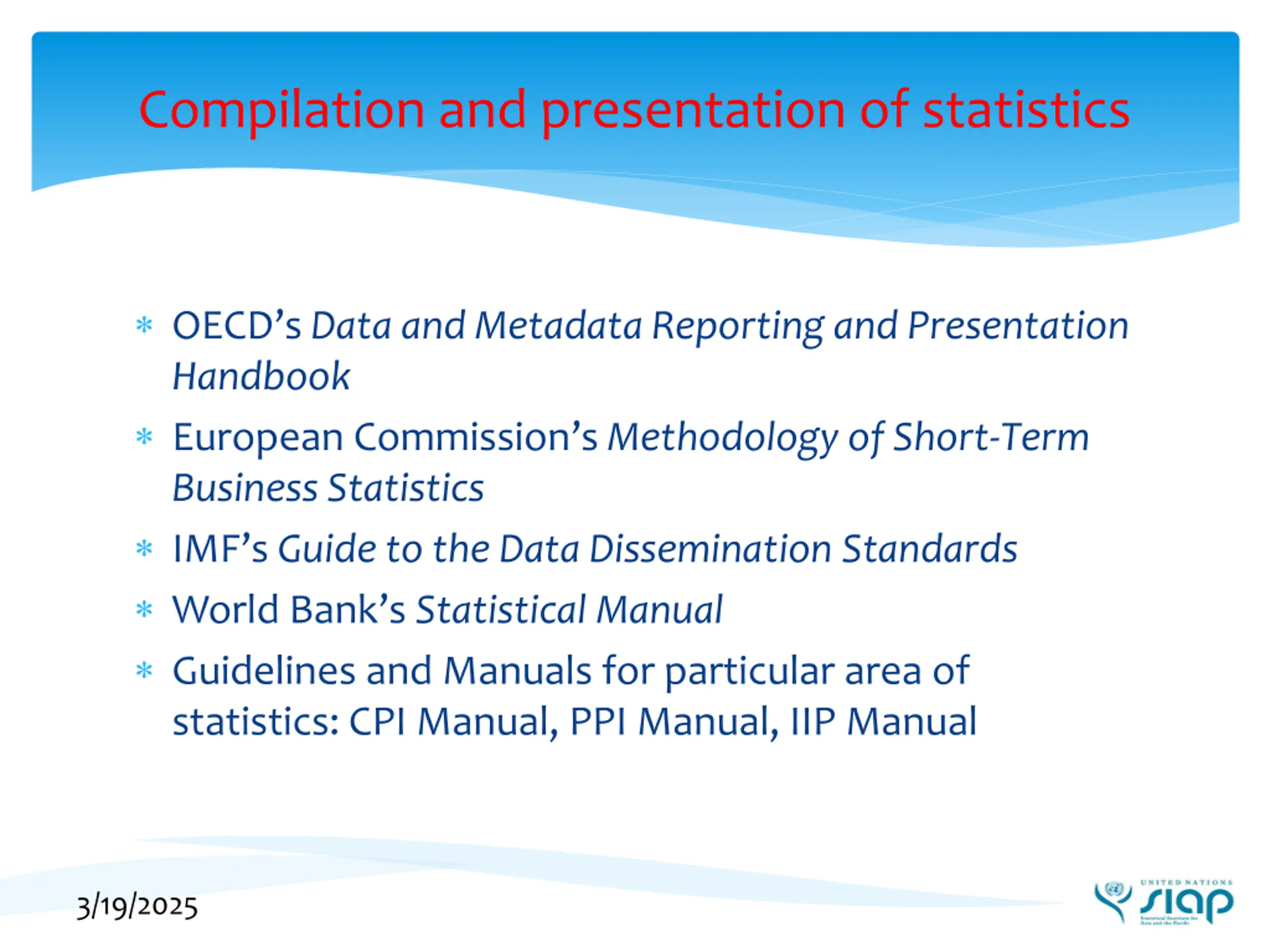 Compilation and presentation of statistics OECD s Data and Metadata Reporting and Presentation Handbook European Commission s Methodology of Short-Term Business Statistics IMF s Guide to the Data Dissemination Standards World Bank s Statistical Manual Guidelines and Manuals for particular area of statistics: CPI Manual, PPI Manual, IIP Manual 3/19/2025