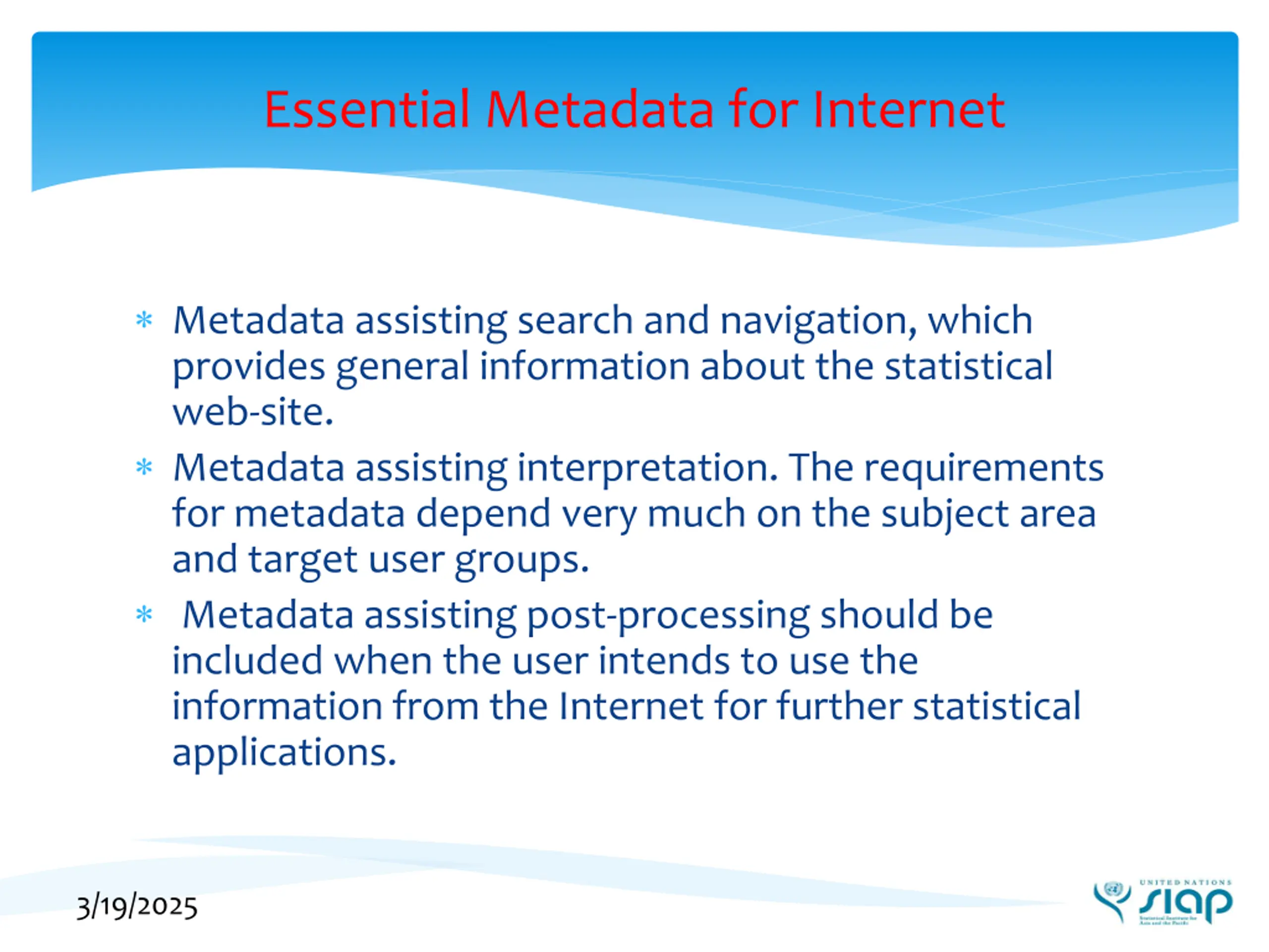Essential Metadata for Internet Metadata assisting search and navigation, which provides general information about the statistical web-site. Metadata assisting interpretation. The requirements for metadata depend very much on the subject area and target user groups. Metadata assisting post-processing should be included when the user intends to use the information from the Internet for further statistical applications. 3/19/2025