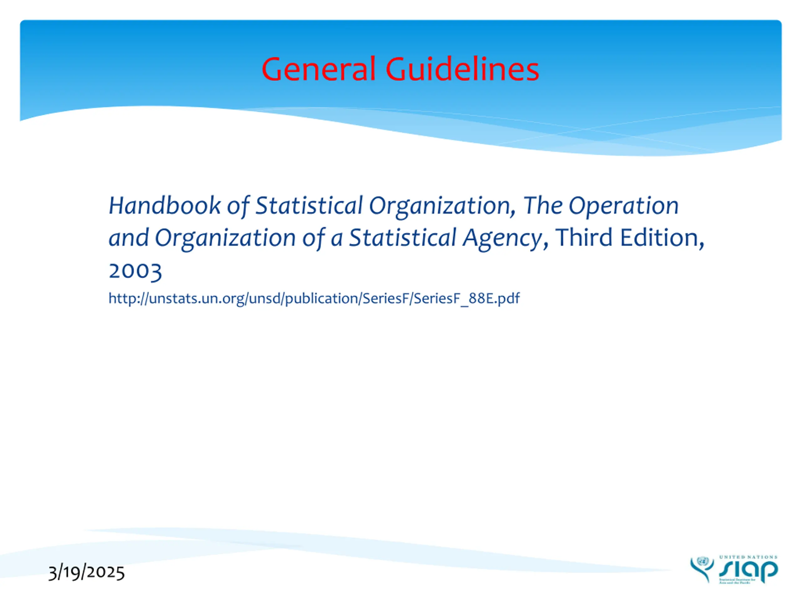 General Guidelines Handbook of Statistical Organization, The Operation and Organization of a Statistical Agency, Third Edition, 2003 http://unstats.un.org/unsd/publication/SeriesF/SeriesF_88E.pdf 3/19/2025