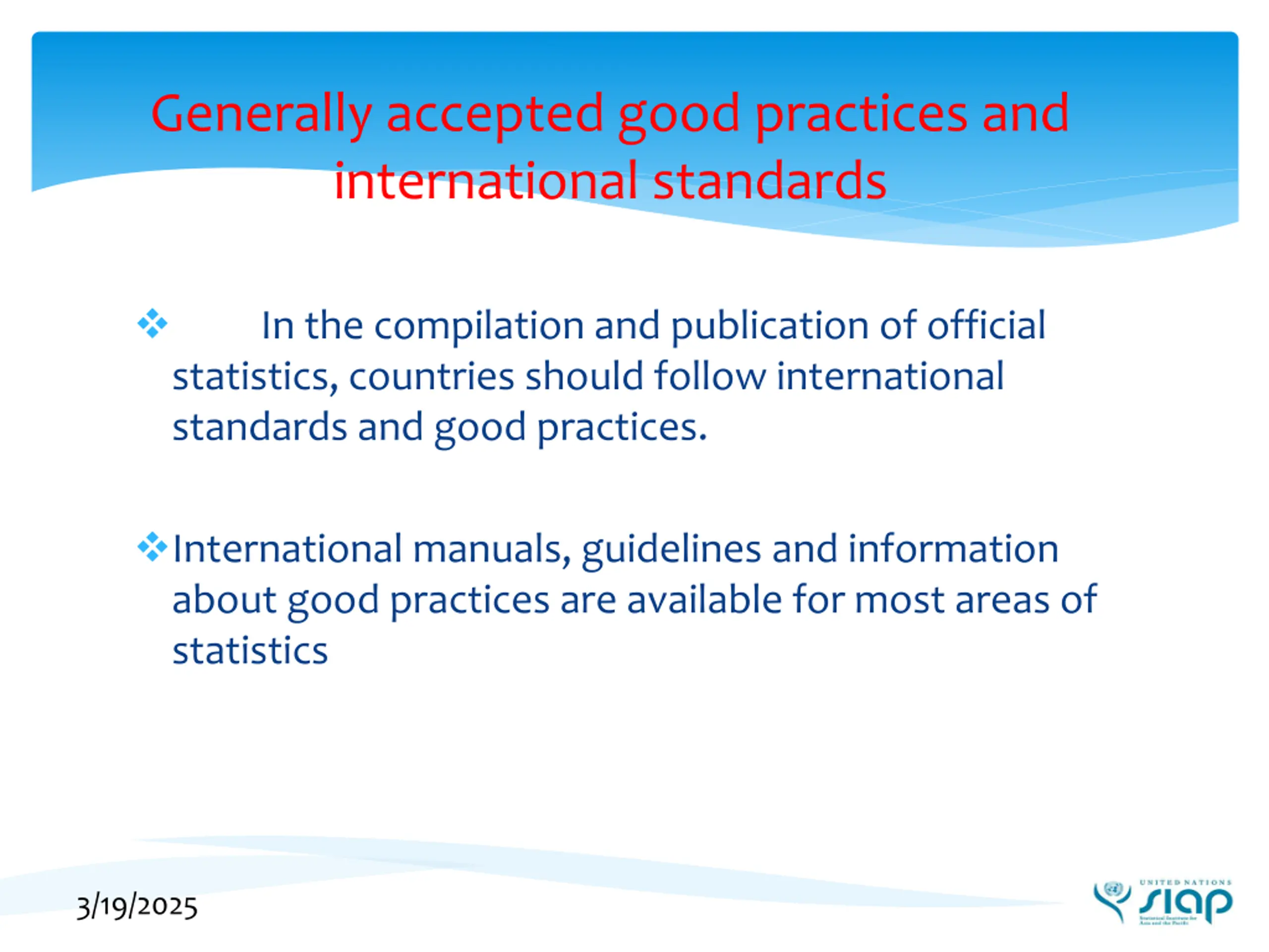 Generally accepted good practices and international standards In the compilation and publication of official statistics, countries should follow international standards and good practices. International manuals, guidelines and information about good practices are available for most areas of statistics 3/19/2025