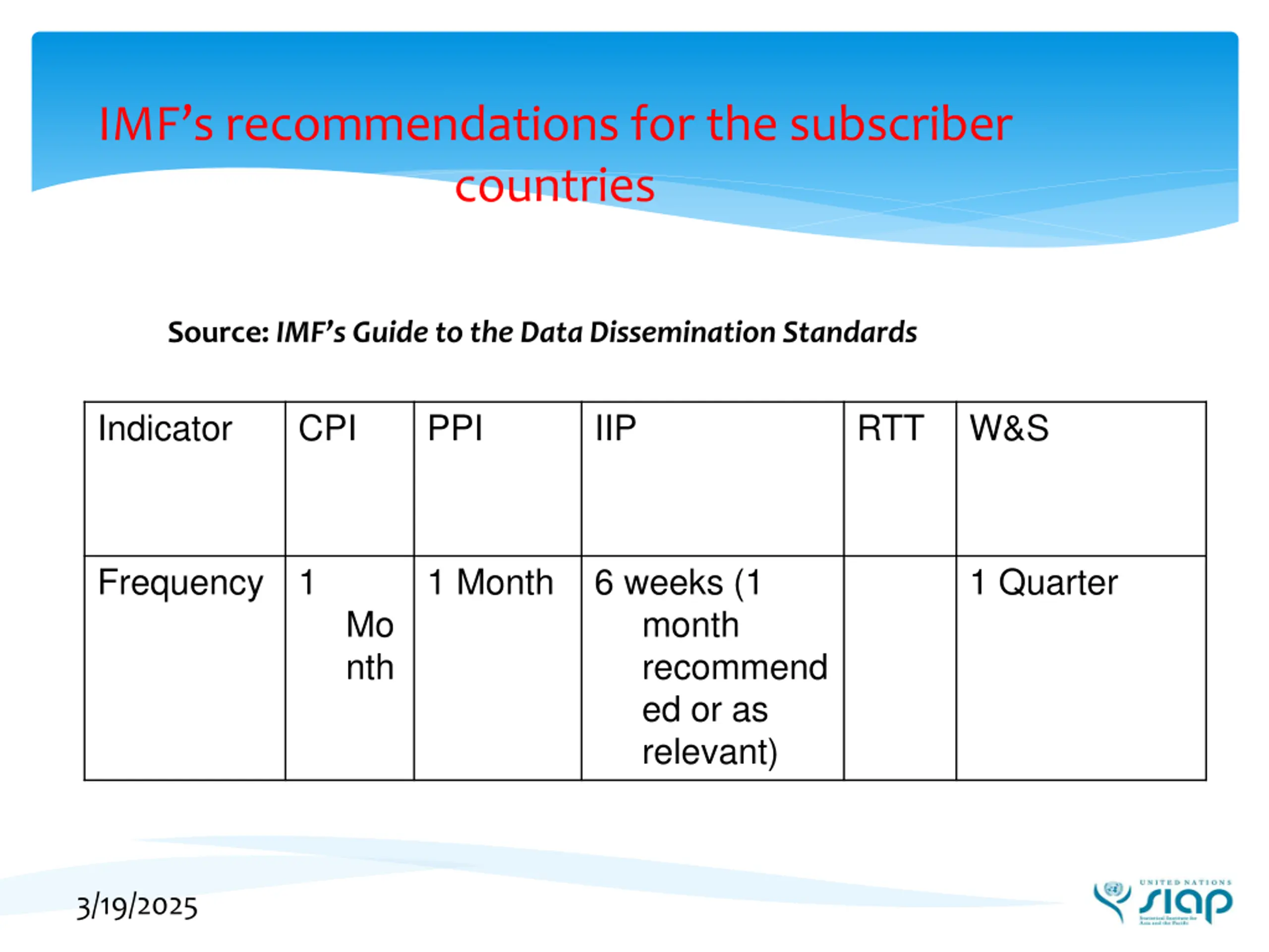 IMFs recommendations for the subscriber countries Source:IMF s Guide to the Data Dissemination Standards Indicator CPI PPI IIP RTT W&S Frequency 1 1 Month 6 weeks (1 1 Quarter Mo nth month recommend ed or as relevant) 3/19/2025
