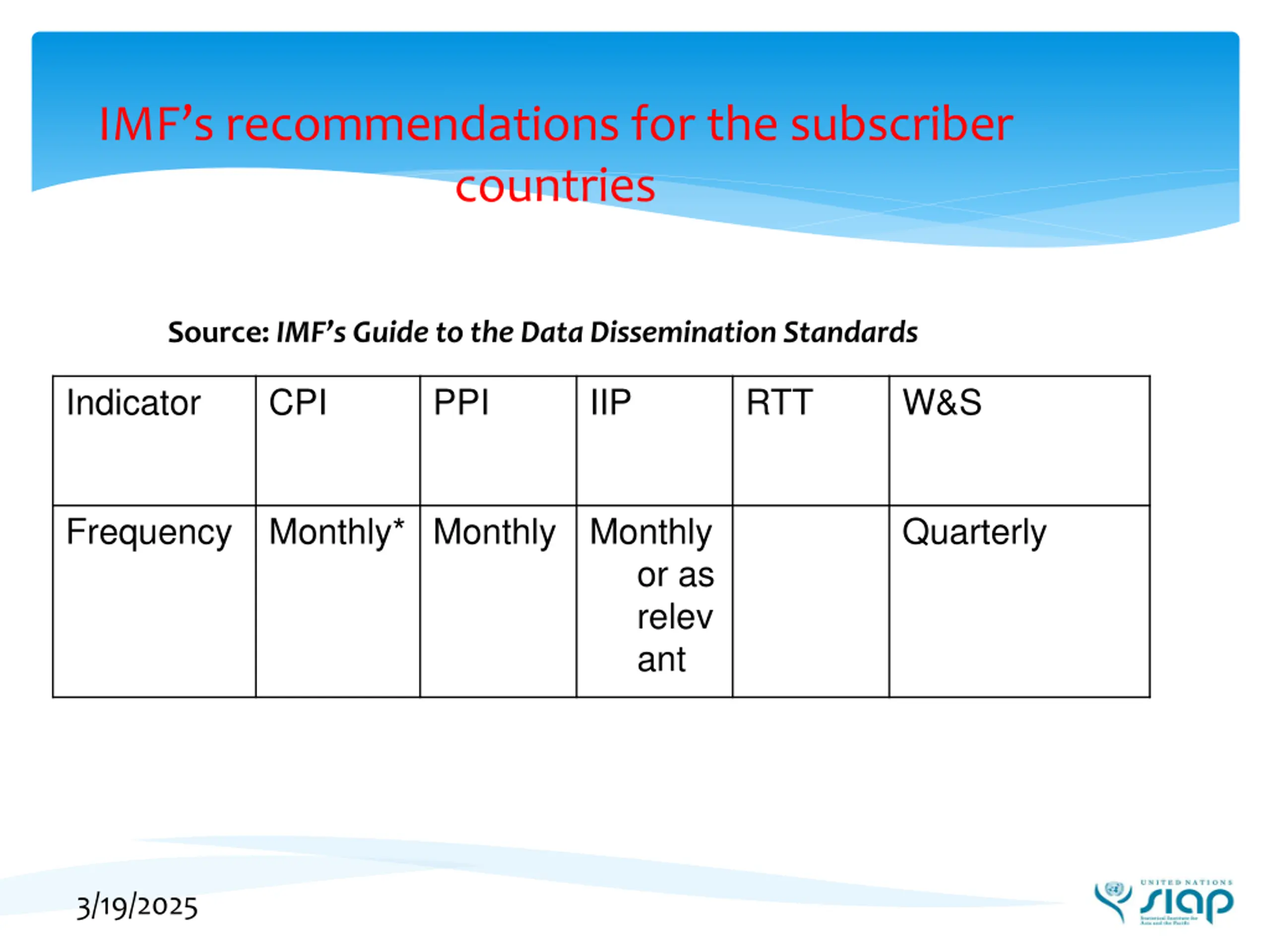 IMFs recommendations for the subscriber countries Source:IMF s Guide to the Data Dissemination Standards Indicator CPI PPI IIP RTT W&S Frequency Monthly* Monthly Monthly or as relev ant Quarterly 3/19/2025