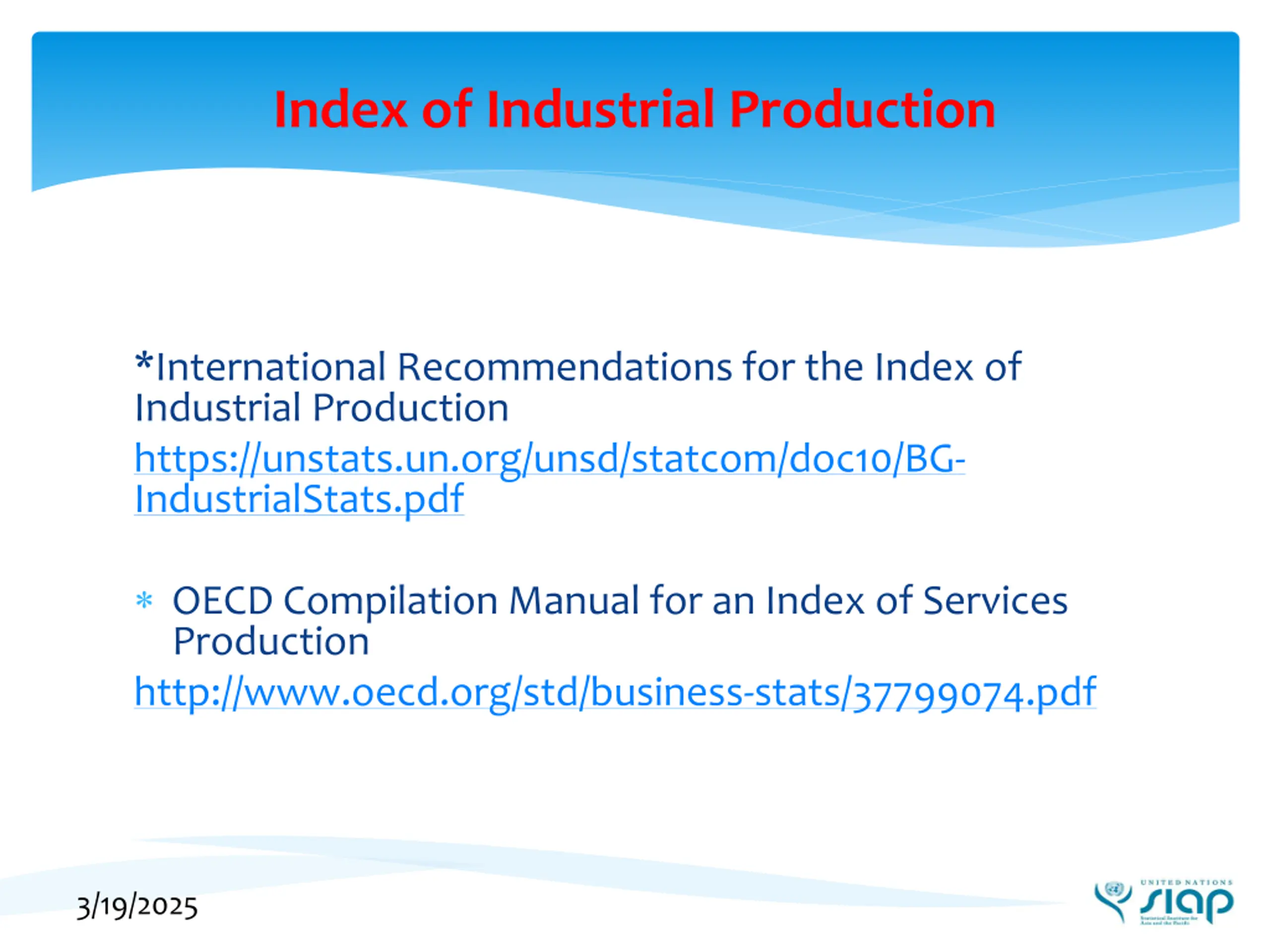 Index of Industrial Production *International Recommendations for the Index of Industrial Production https://unstats.un.org/unsd/statcom/doc10/BG- IndustrialStats.pdf OECD Compilation Manual for an Index of Services Production http://www.oecd.org/std/business-stats/37799074.pdf 3/19/2025