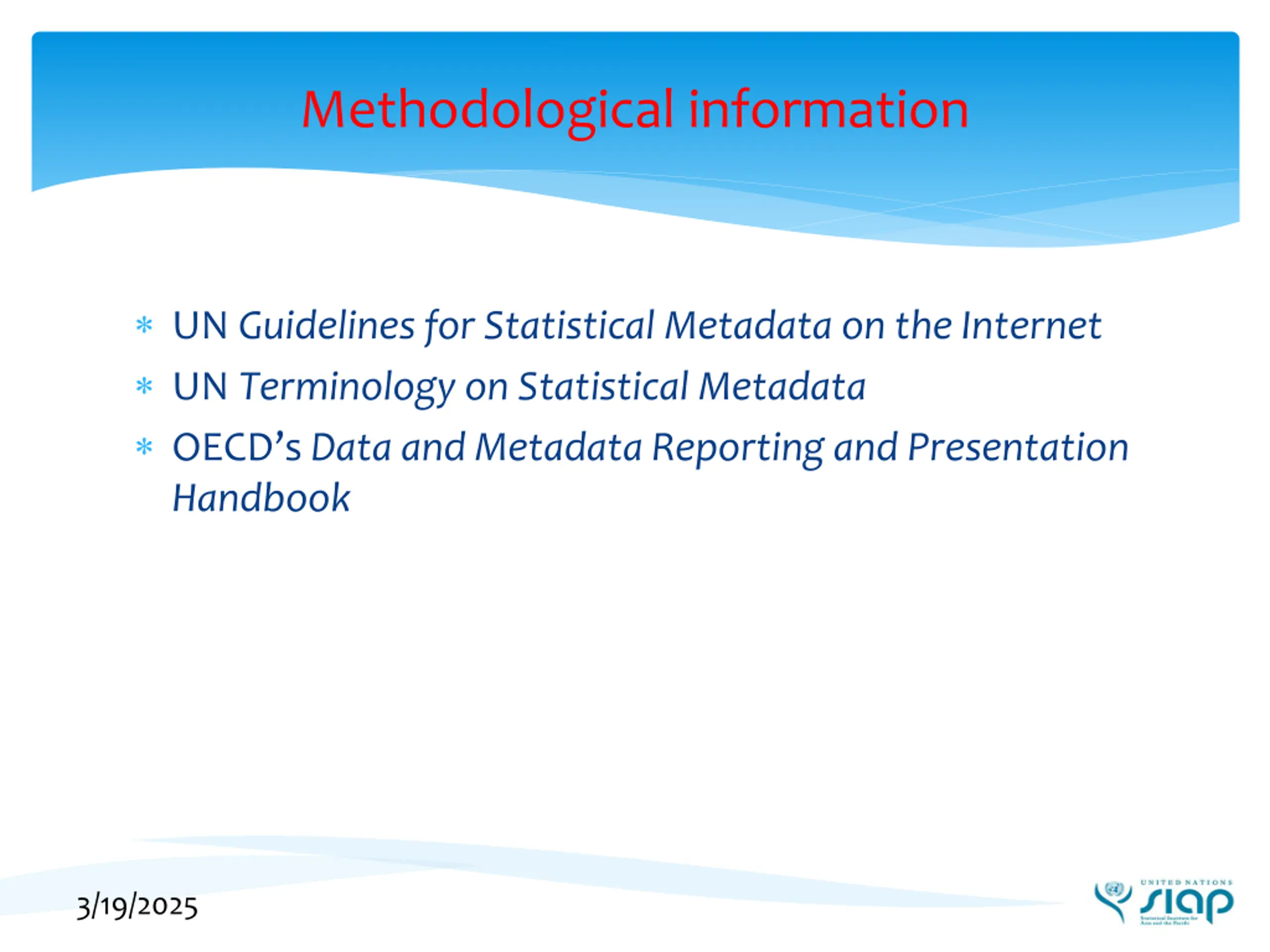 Methodological information UN Guidelines for Statistical Metadata on the Internet UN Terminology on Statistical Metadata OECD s Data and Metadata Reporting and Presentation Handbook 3/19/2025