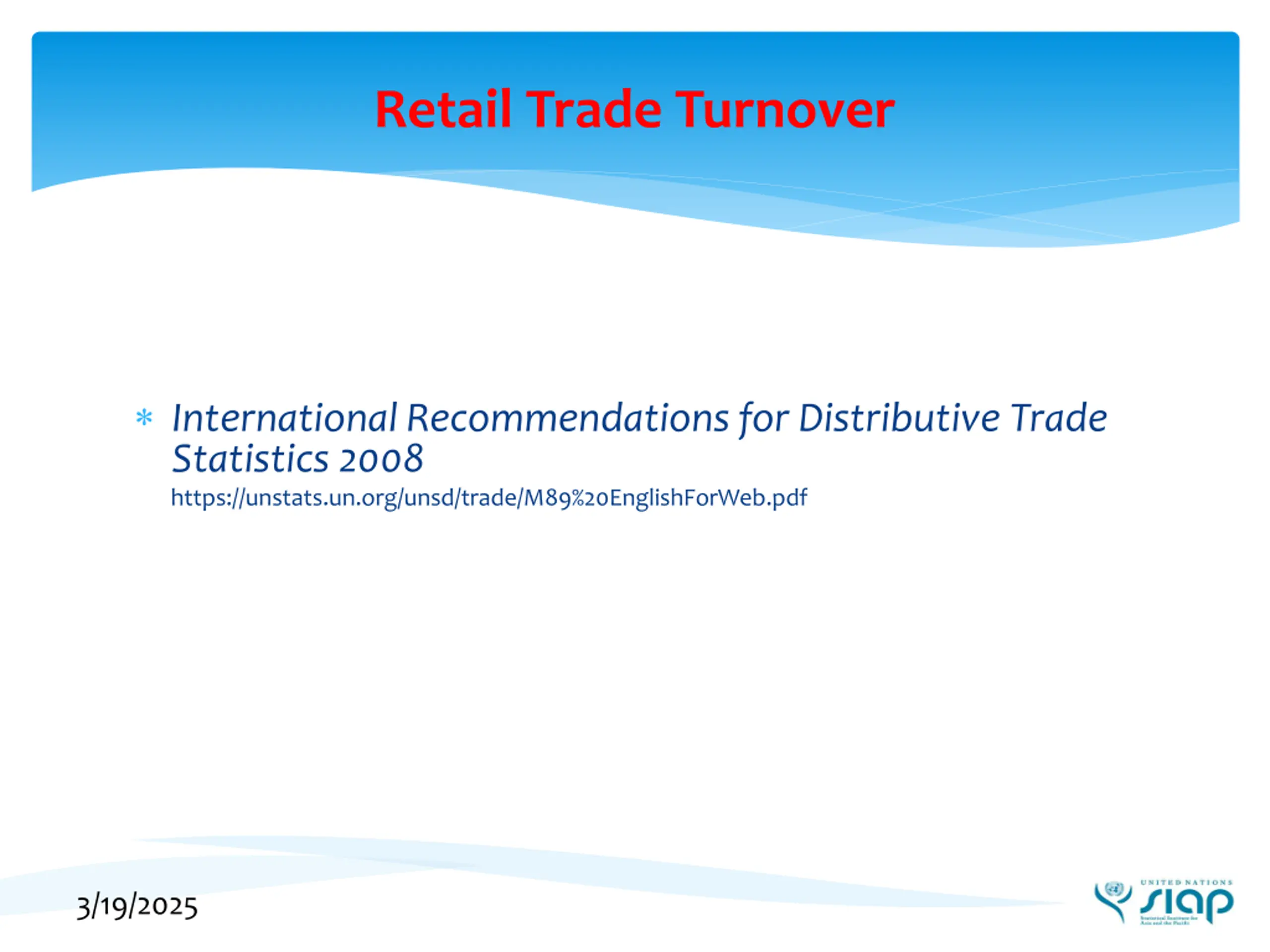 Retail Trade Turnover International Recommendations for Distributive Trade Statistics 2008 https://unstats.un.org/unsd/trade/M89%20EnglishForWeb.pdf 3/19/2025