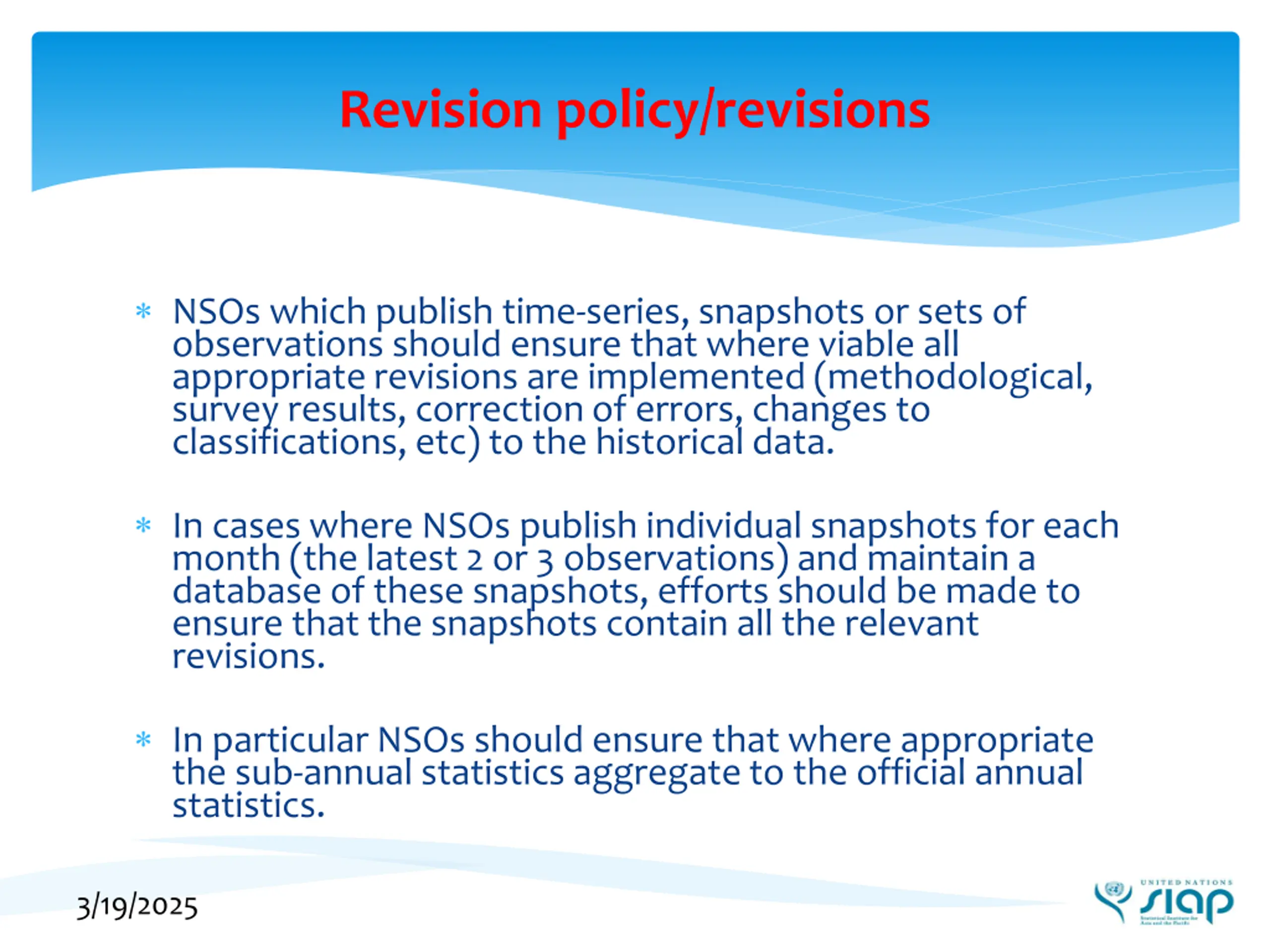 Revision policy/revisions NSOs which publish time-series, snapshots or sets of observations should ensure that where viable all appropriate revisions are implemented (methodological, survey results, correction of errors, changes to classifications, etc) to the historical data. In cases where NSOs publish individual snapshots for each month (the latest 2 or 3 observations) and maintain a database of these snapshots, efforts should be made to ensure that the snapshots contain all the relevant revisions. In particular NSOs should ensure that where appropriate the sub-annual statistics aggregate to the official annual statistics. 3/19/2025