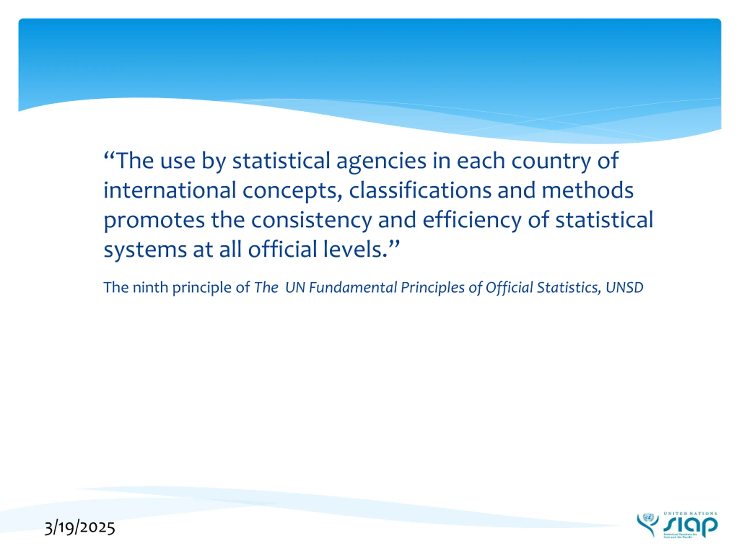 The use by statistical agencies in each country of international concepts, classifications and methods promotes the consistency and efficiency of statistical systems at all official levels. The ninth principle of The UN Fundamental Principles of Official Statistics, UNSD 3/19/2025