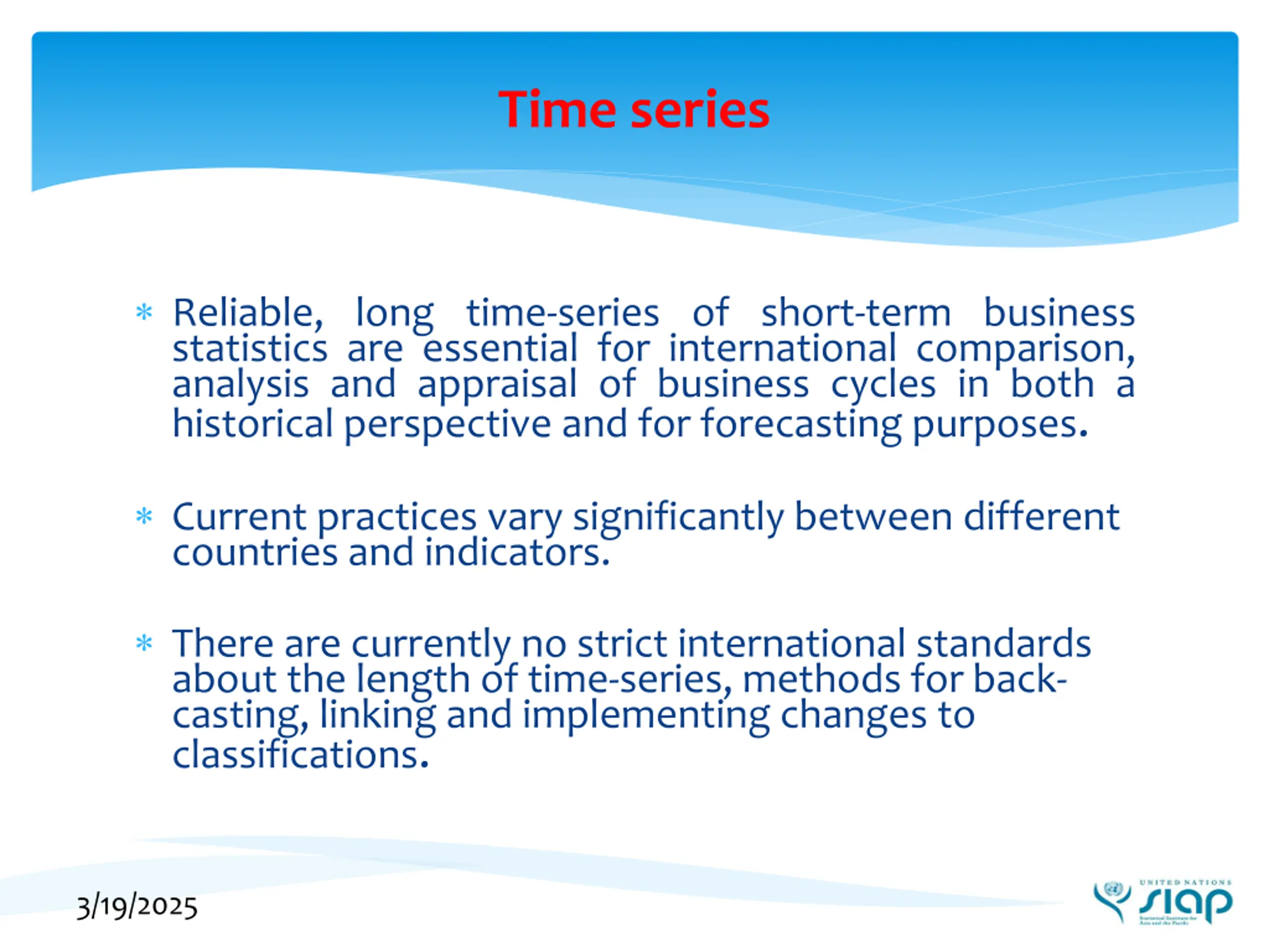 Time series Reliable, long time-series of short-term business statistics are essential for international comparison, analysis and appraisal of business cycles in both a historical perspective and for forecasting purposes. Current practices vary significantly between different countries and indicators. There are currently no strict international standards about the length of time-series, methods for back- casting, linking and implementing changes to classifications. 3/19/2025