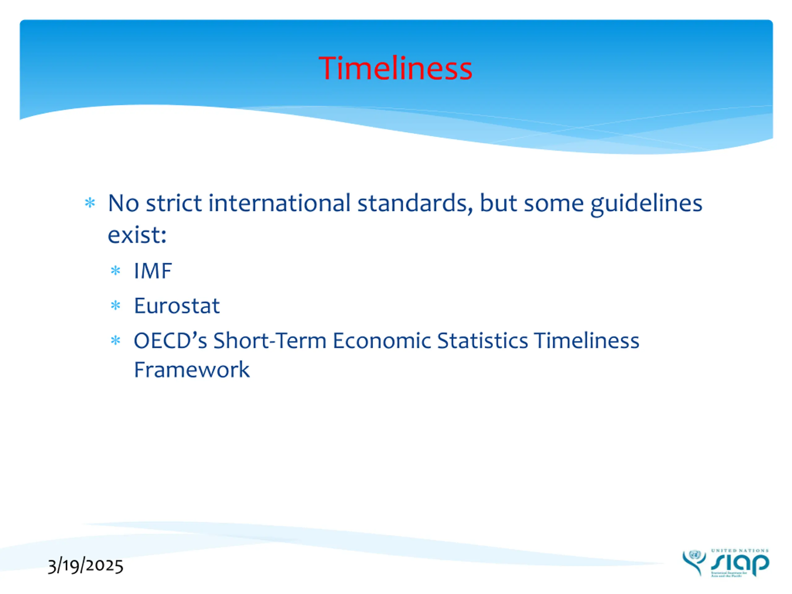 Timeliness No strict international standards, but some guidelines exist: IMF Eurostat OECD s Short-Term Economic Statistics Timeliness Framework 3/19/2025