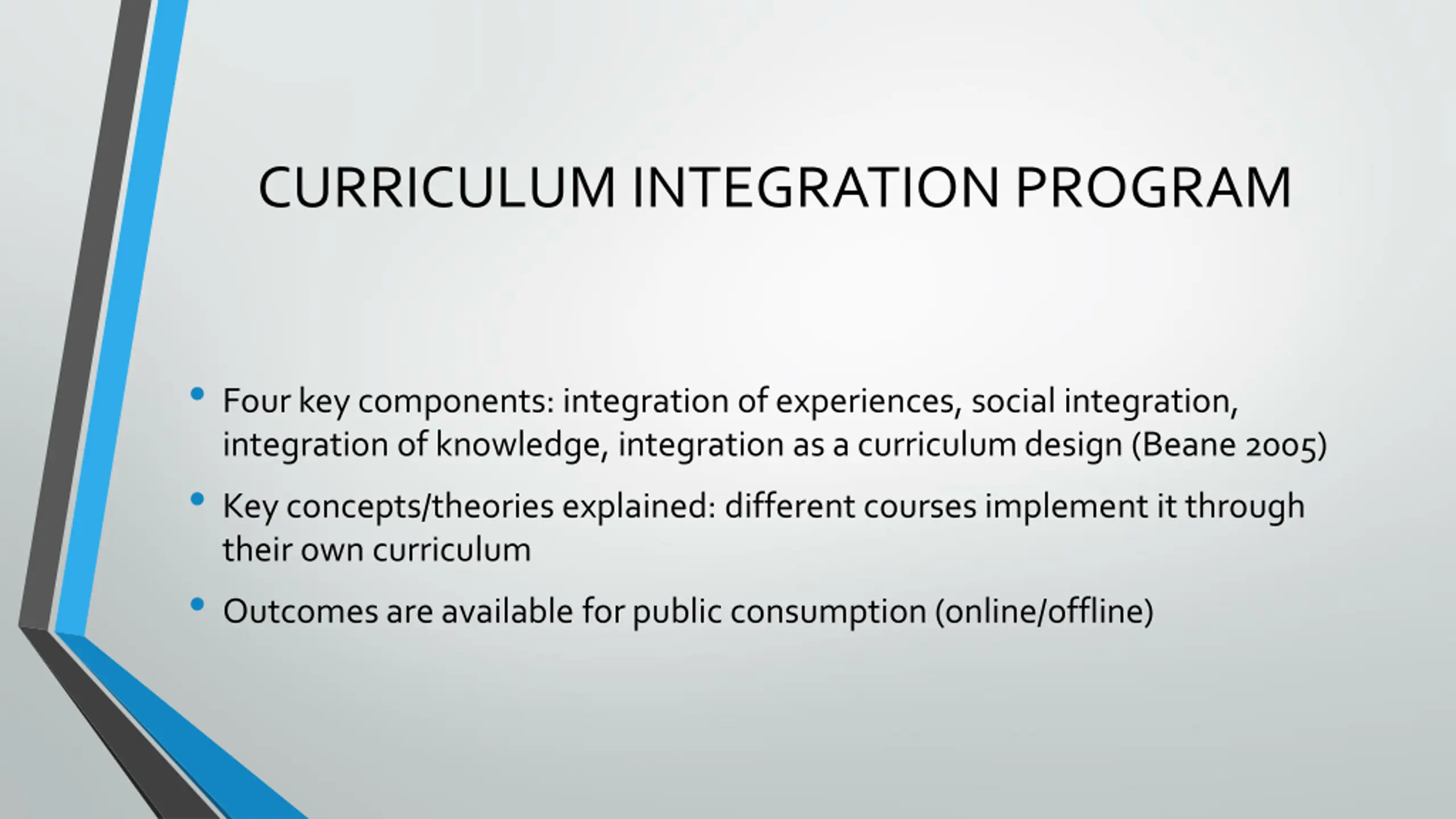 CURRICULUM INTEGRATION PROGRAM Four key components: integration of experiences, social integration, integration of knowledge, integration as a curriculum design (Beane 2005) Key concepts/theories explained: different courses implement it through their own curriculum Outcomes are available for public consumption (online/offline)