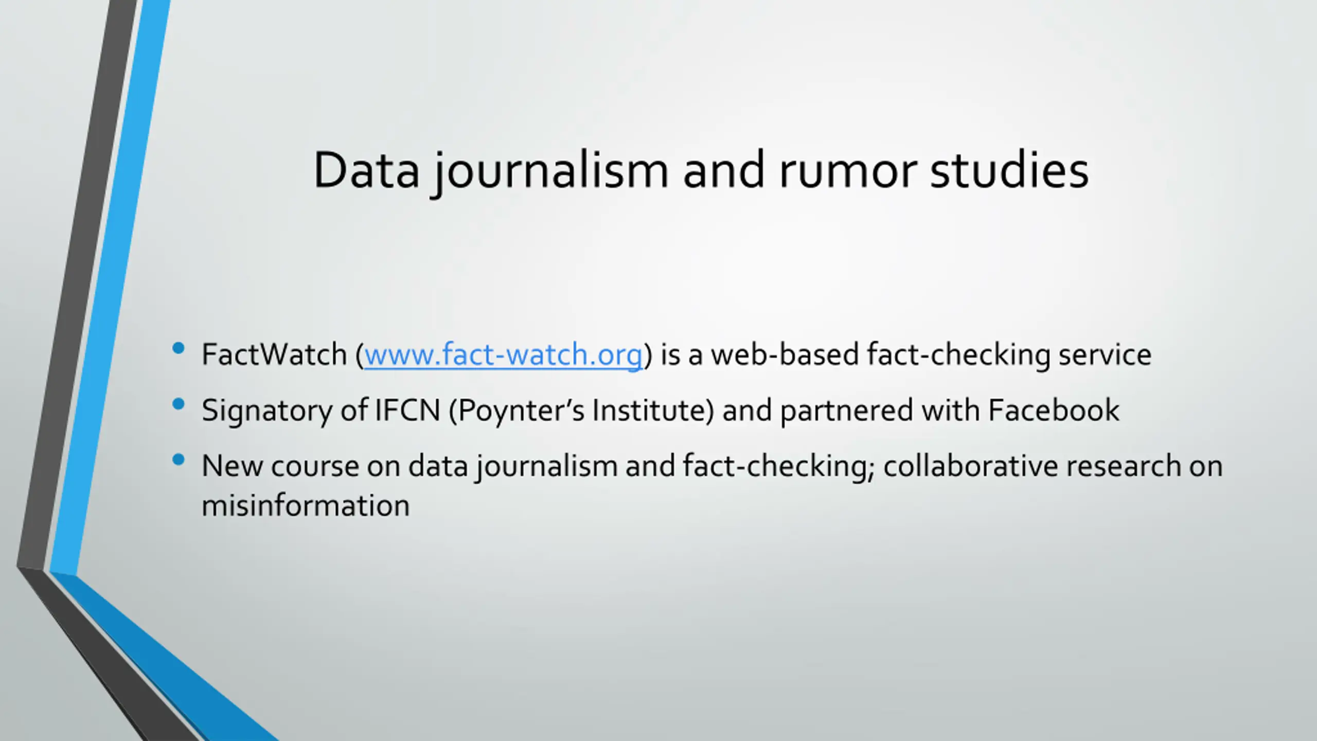 Data journalism and rumor studies FactWatch(www.fact-watch.org) is a web-based fact-checking service Signatory of IFCN (Poynter s Institute) and partnered with Facebook New course on data journalism and fact-checking; collaborative research on misinformation