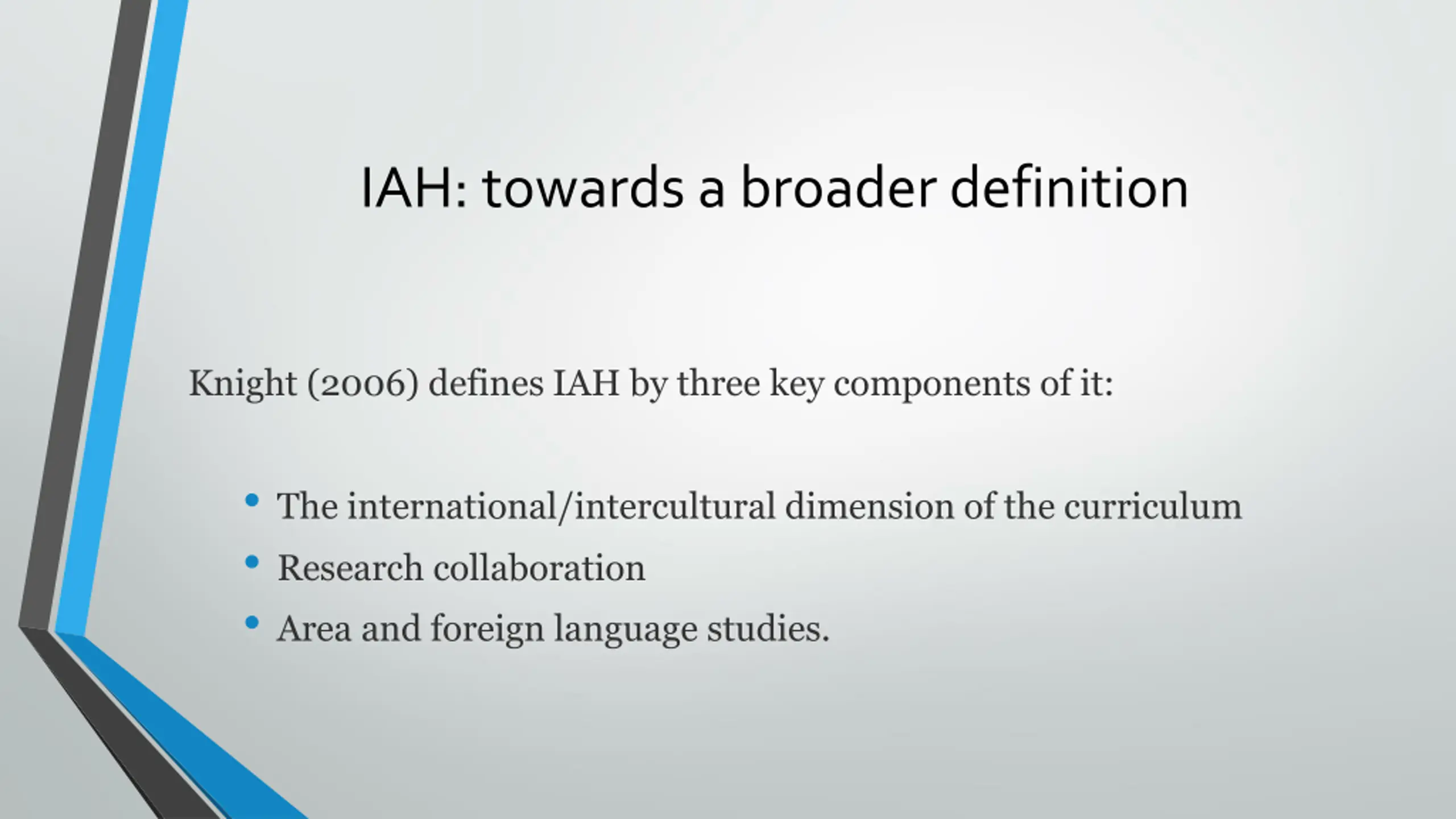 IAH: towards a broader definition Knight (2006) defines IAH by three key components of it: The international/intercultural dimension of the curriculum Research collaboration Area and foreign language studies.